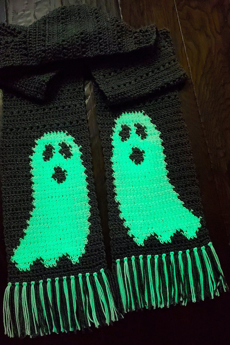 Put the “oo” in “spooky season with this eye-catching scarf, the Gloria Ghost Scarf. The combination of the cute ghost and the glow in the dark yarn helps to take the season from scary to fun with only some yarn and your crochet hook. This design is worked from the ends of the scarf toward the center in 2 separate pieces in back and forth rows. This pattern includes both the graph and written instructions for the ghosts and the scarf pieces, as well as some tips on how to keep your ghost tidy and readable. With a little fringe and some bright light, this scarf will be your favorite Halloween season accessory.