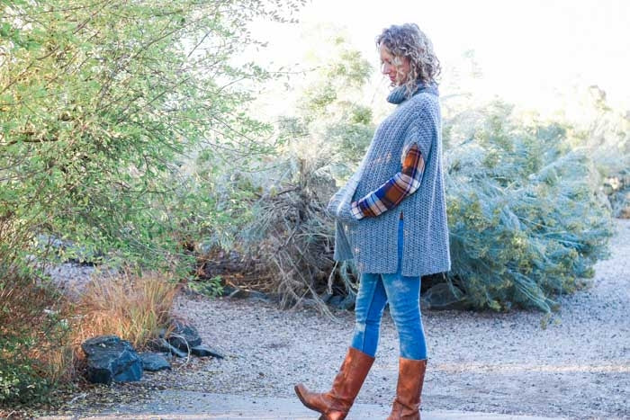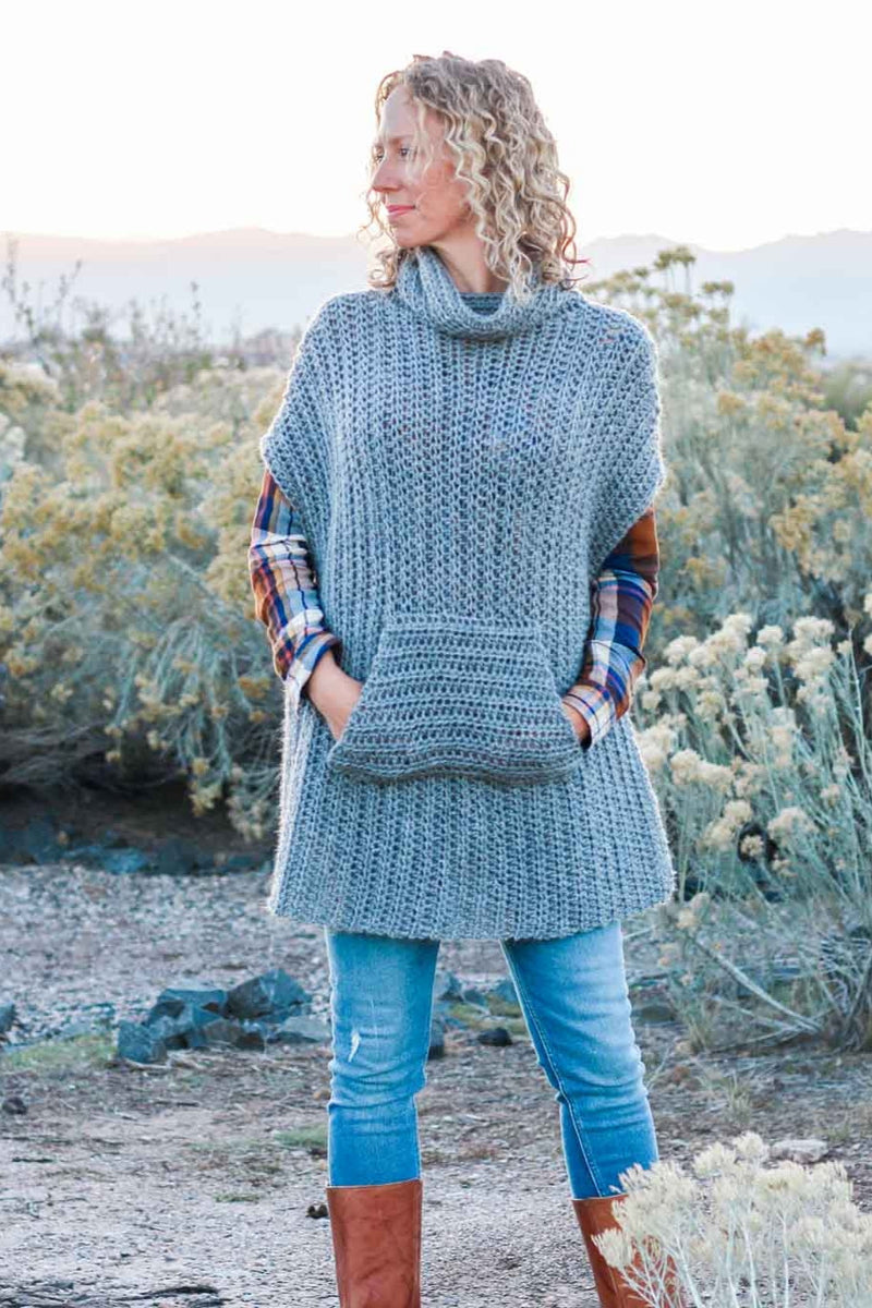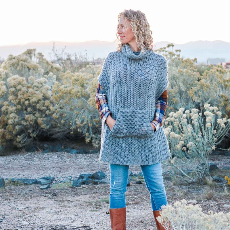 If you love the look of ponchos, but don’t care for the bulk, this pattern is for you! Worked sideways in entirely half double crochet, this crochet poncho is created using a simple increase and decrease repeat. The addition of the cowl neck and front pocket make for a super cozy piece that you can layer all fall and winter long.