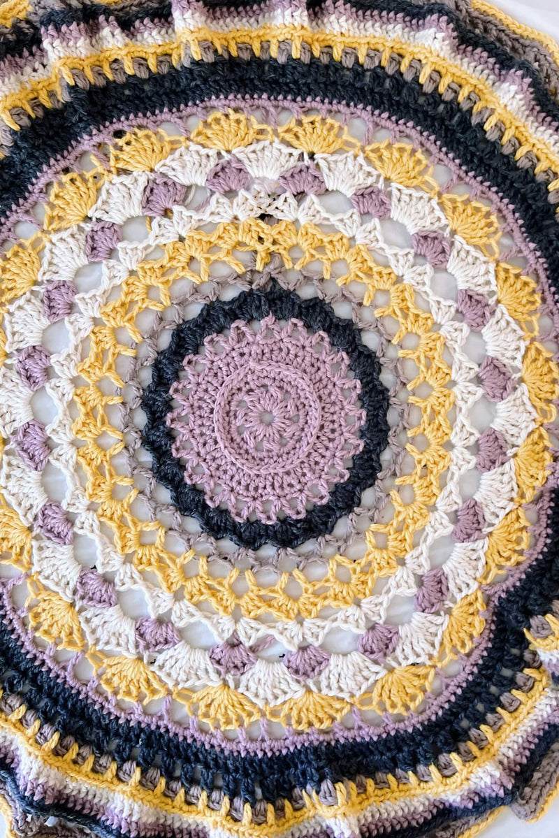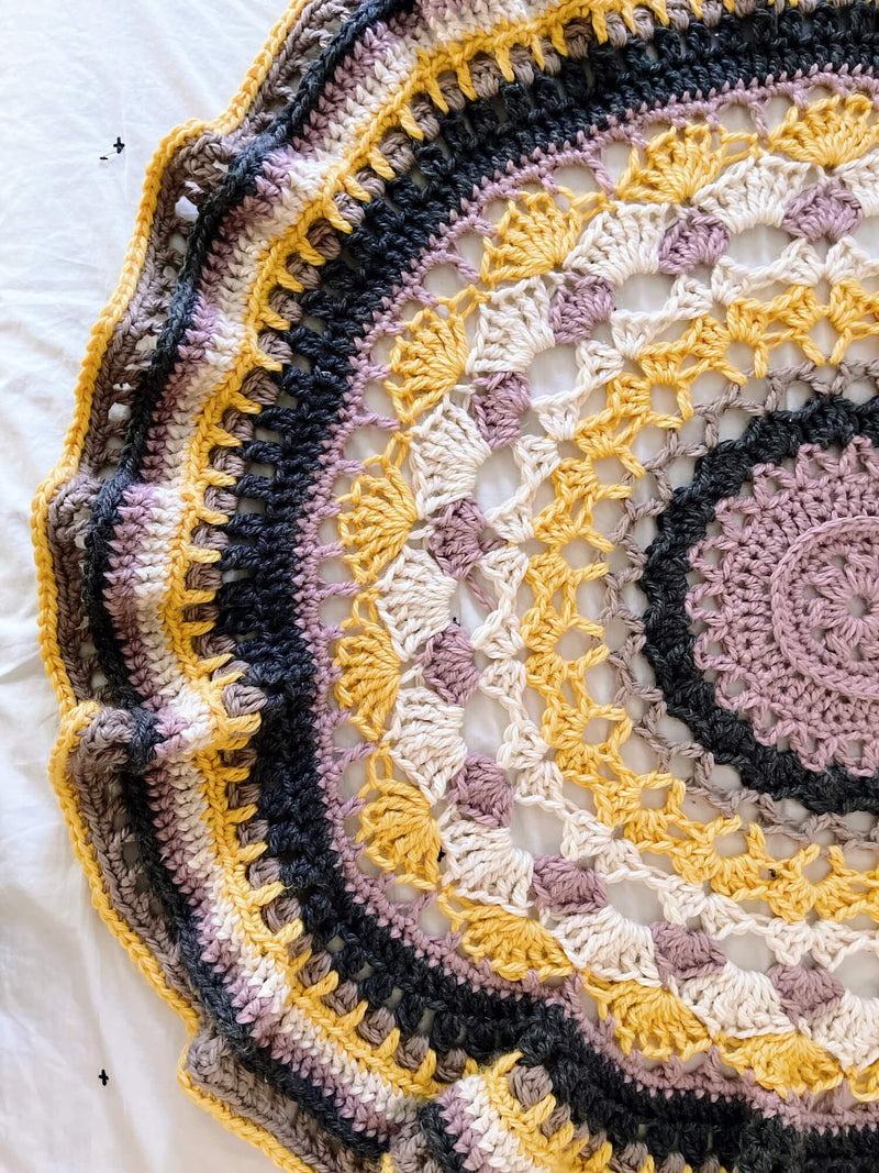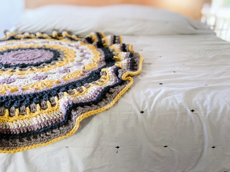 Indulge in the cozy embrace of this crochet mandala blanket, an ode to autumn romance and the whimsical allure of Halloween. Its modern color palette, reminiscent of the season's golden leaves and the rich hues of garden mums, invites you to snuggle up and experience the warmth of fall love.