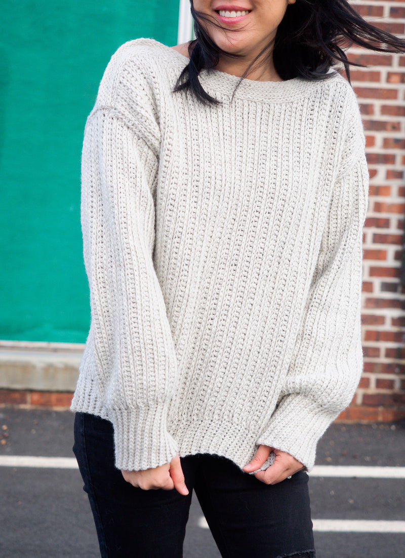 The High Line Sweater features a unique crochet rib stitch, straight sleeves for freedom of movement, split ribbing at the waist, and a woven-look strip at the neckline for a drapey, boatneck collar. Worked up in Wool Ease, the High Line sweater is comfortably oversized, while still light and warm, making it a pullover you’ll want to wear every day. For extra flair, add optional buttons along the shoulder tabs!