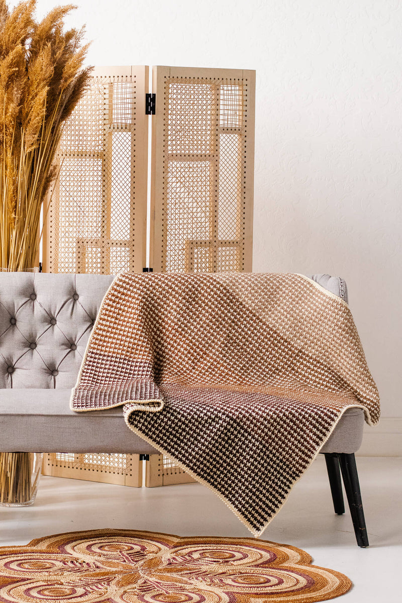 4 x 4” (10 x 10 cm) = 14 sts and 12 rows in the houndstooth stitch with Main Gauge (larger) hook, blocked.
