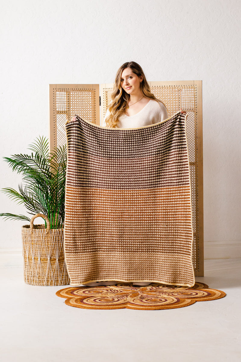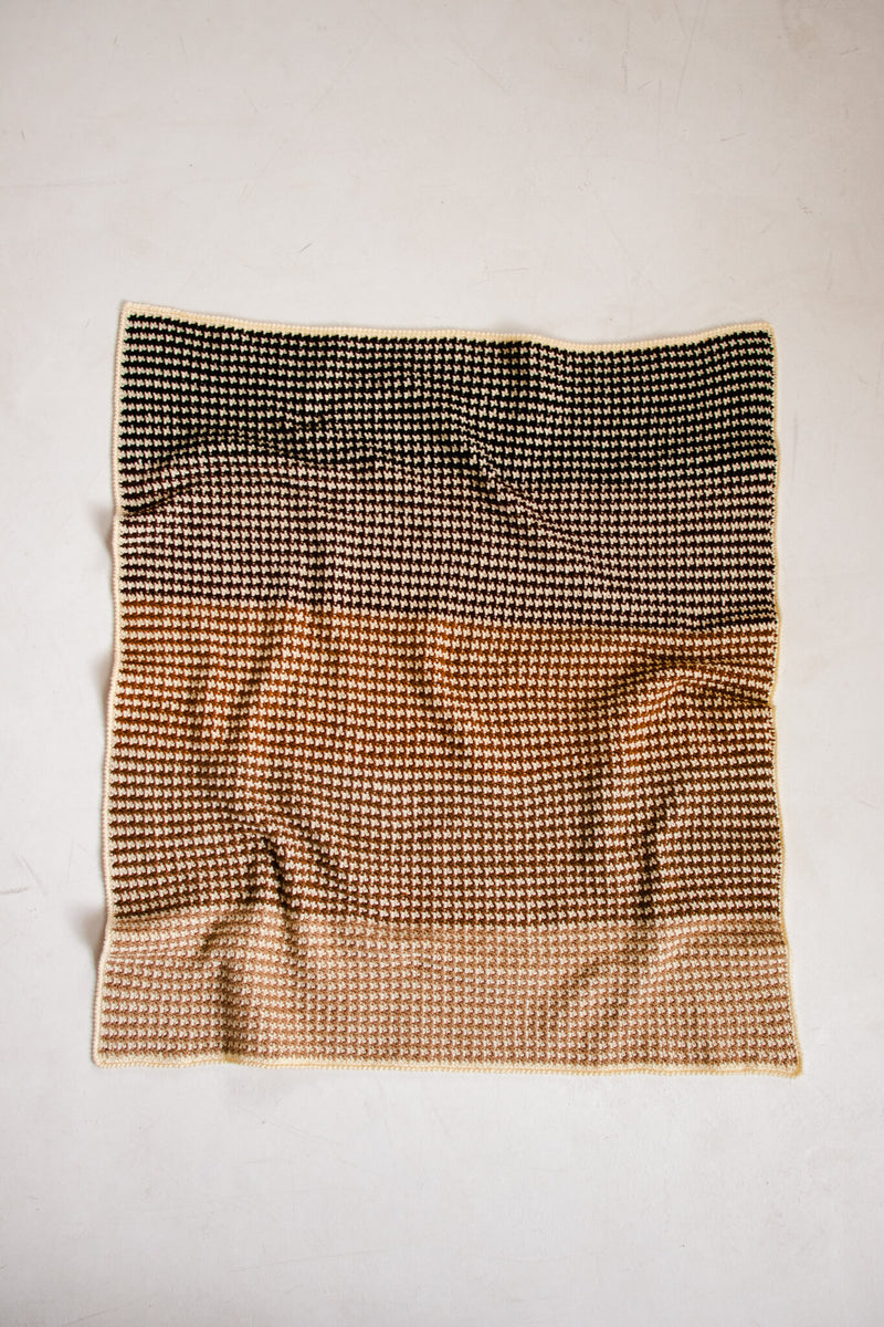 This blanket uses alternating single crochets and double crochets while changing colors each row to create the houndstooth stitch. One main color is used while transitioning 4 or 5 accent colors to create the appearance of an ombré/fade until your blanket reaches your desired size. Feel free to choose any colors you love; your blanket does not have to fade as the sample blanket does - bright sections of color would be just as lovely!