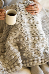 Cuddle up with the squishiest bobbles and the softest yarn you’ve ever felt! This luscious blanket is cute, modern and looks amazing in your fave space. Crocheted while holding two strands of plush yarn together, this throw turns out lofty and slightly chunky. Two sizes are available, so make it for your little one (baby blankie size) or for yourself.