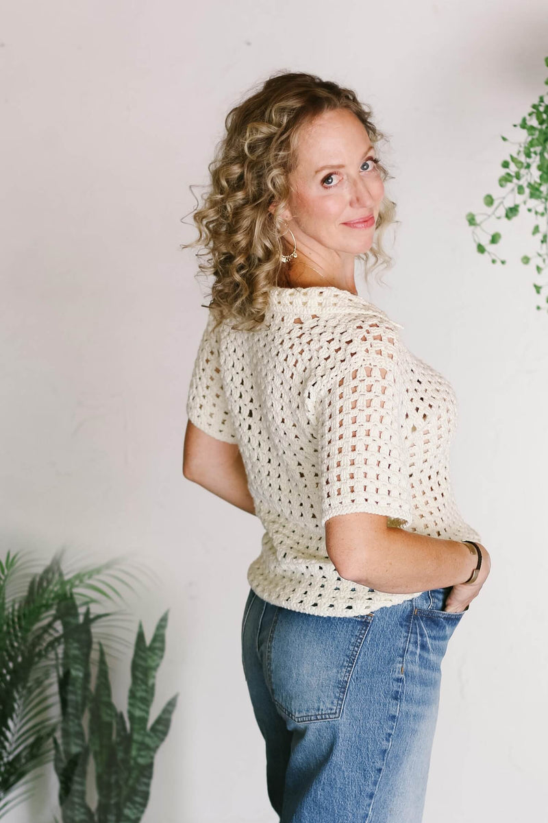 for those hot days when you still want to look put together. The grid-like stitch pattern is clean and modern, while the collar adds a hint of polish. With almost no seaming and simple stitches, this is the meditative poolside project you’ve been waiting for.