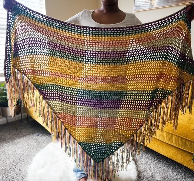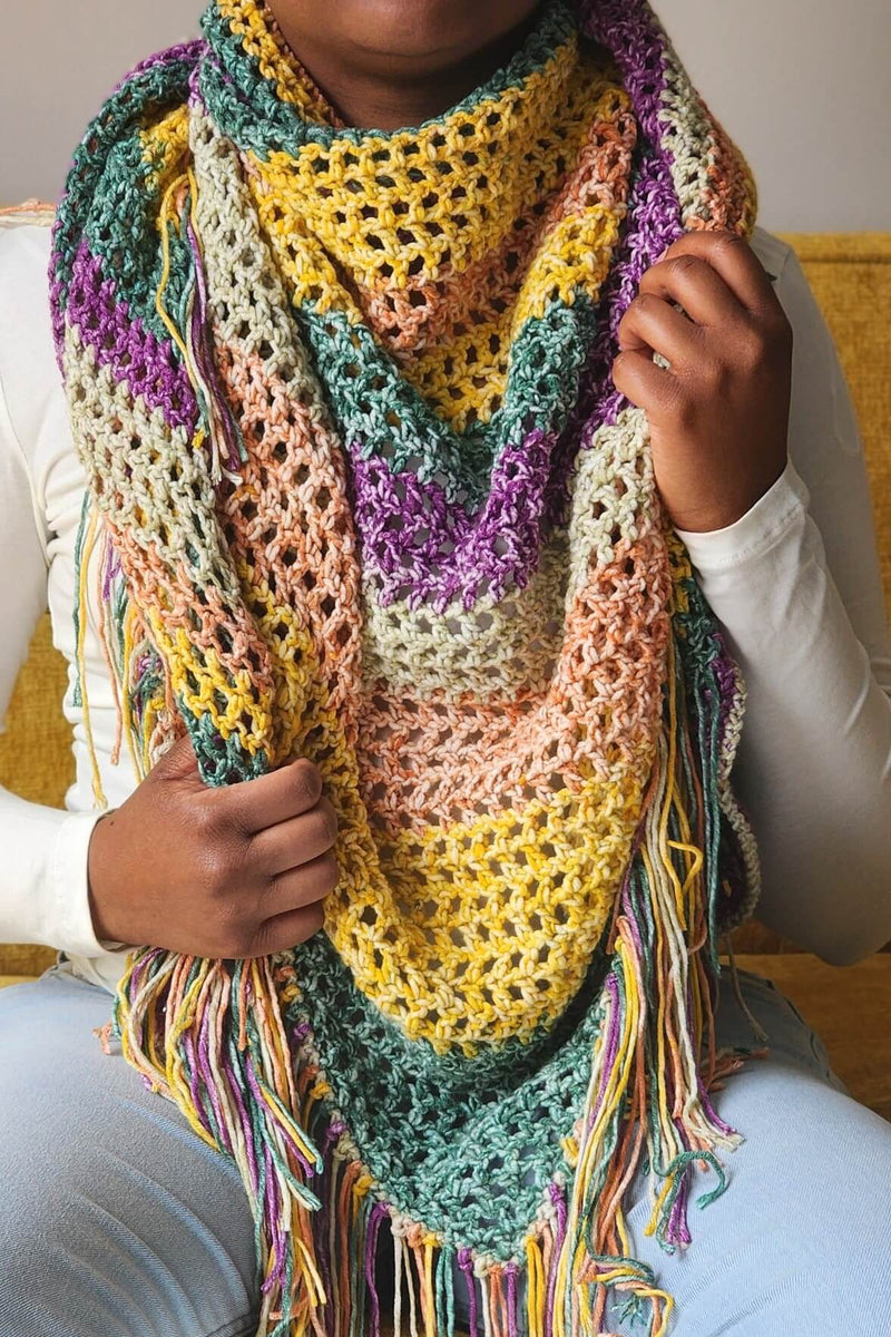 The Muriel Mesh Shawl crochet pattern features a basic openwork design, perfect for adding a light, airy touch to any outfit. Ideal for layering over dresses, blouses, or jeans, its breathable mesh design is perfect for transitional seasons. The pattern is simple and accessible for crocheters of all skill levels, and the self-striping yarn adds a vibrant pop of color with minimal effort.