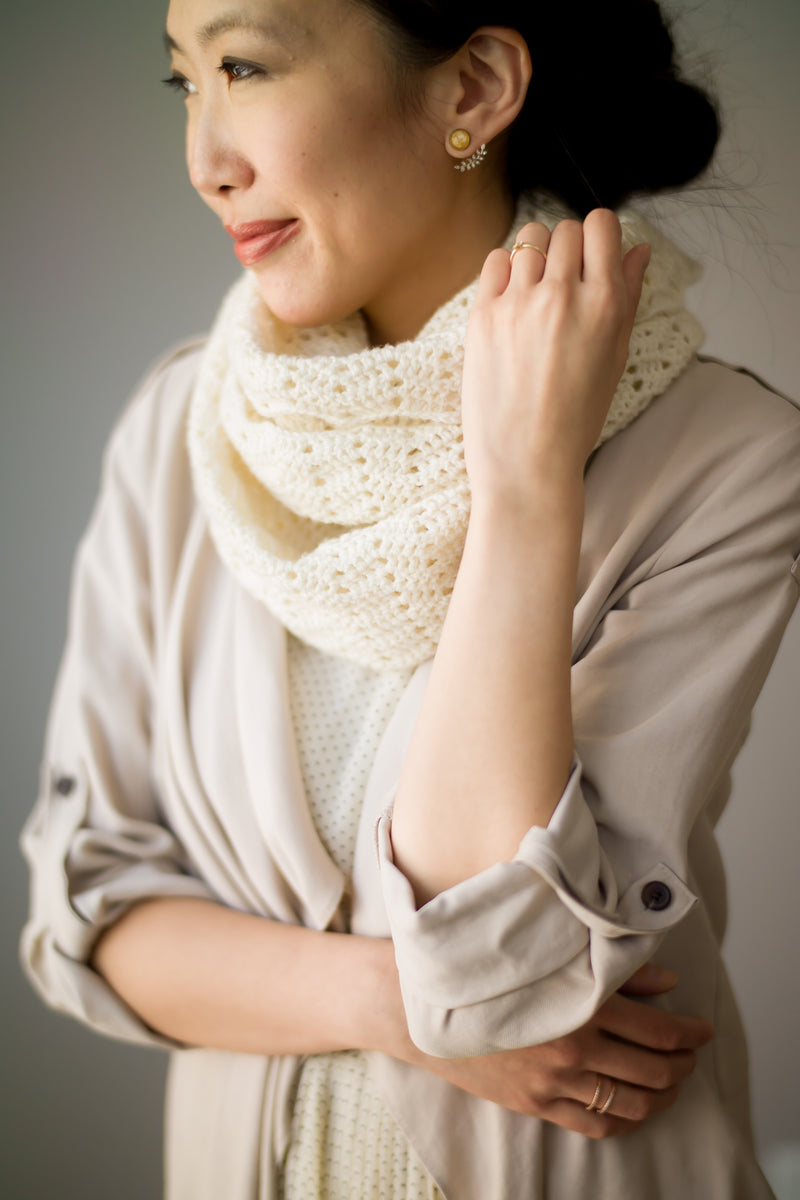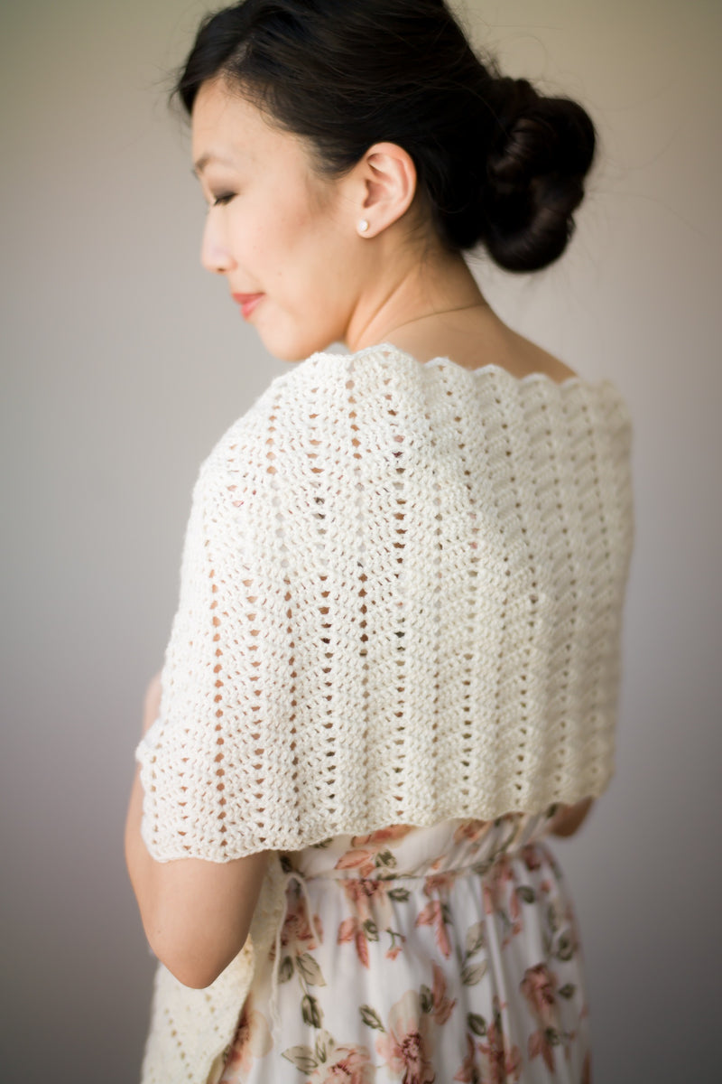 Crochet this romantic scarf wrap featuring delicate lace and beautiful scalloped edges! Wear it as a wrap over dresses or as a scarf that can be worn long or twisted and folded. This dainty piece adds a touch of elegance and sophistication using luxurious Superwash Merino Yarn.
