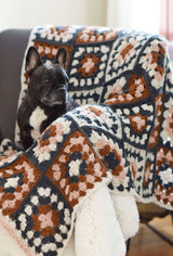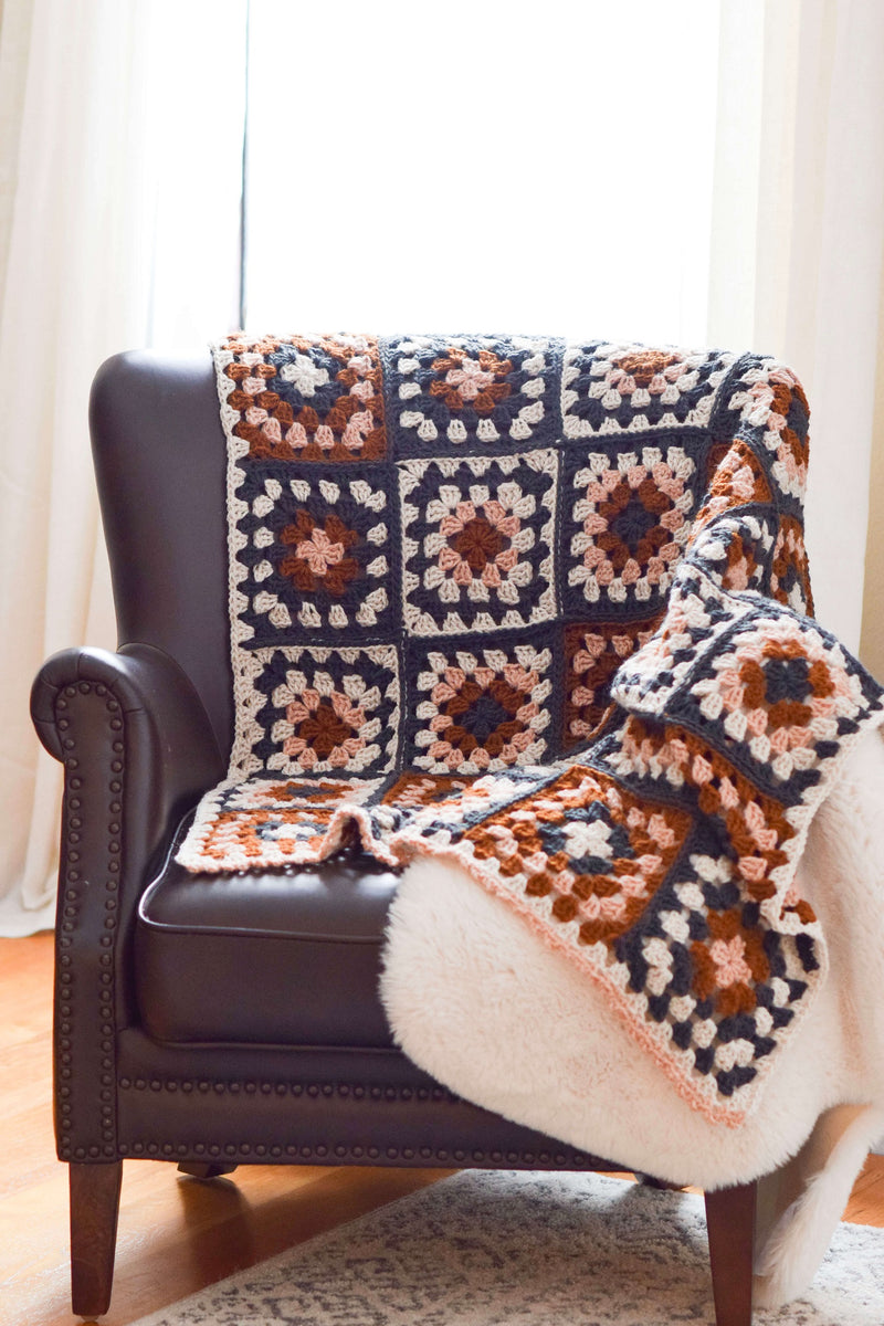 A modern take on the classic granny square blanket, this on-trend throw makes for a fun and beautiful project! Completely customizable, pick your favorite four colors, and crochet away. Each square is worked in a simple five round pattern, then seamed to finish. Because it’s worked in individual squares, it’s an ideal project to take on-the-go as you get back to traveling this year! Available in two size options, a lapghan or larger throw blanket option.