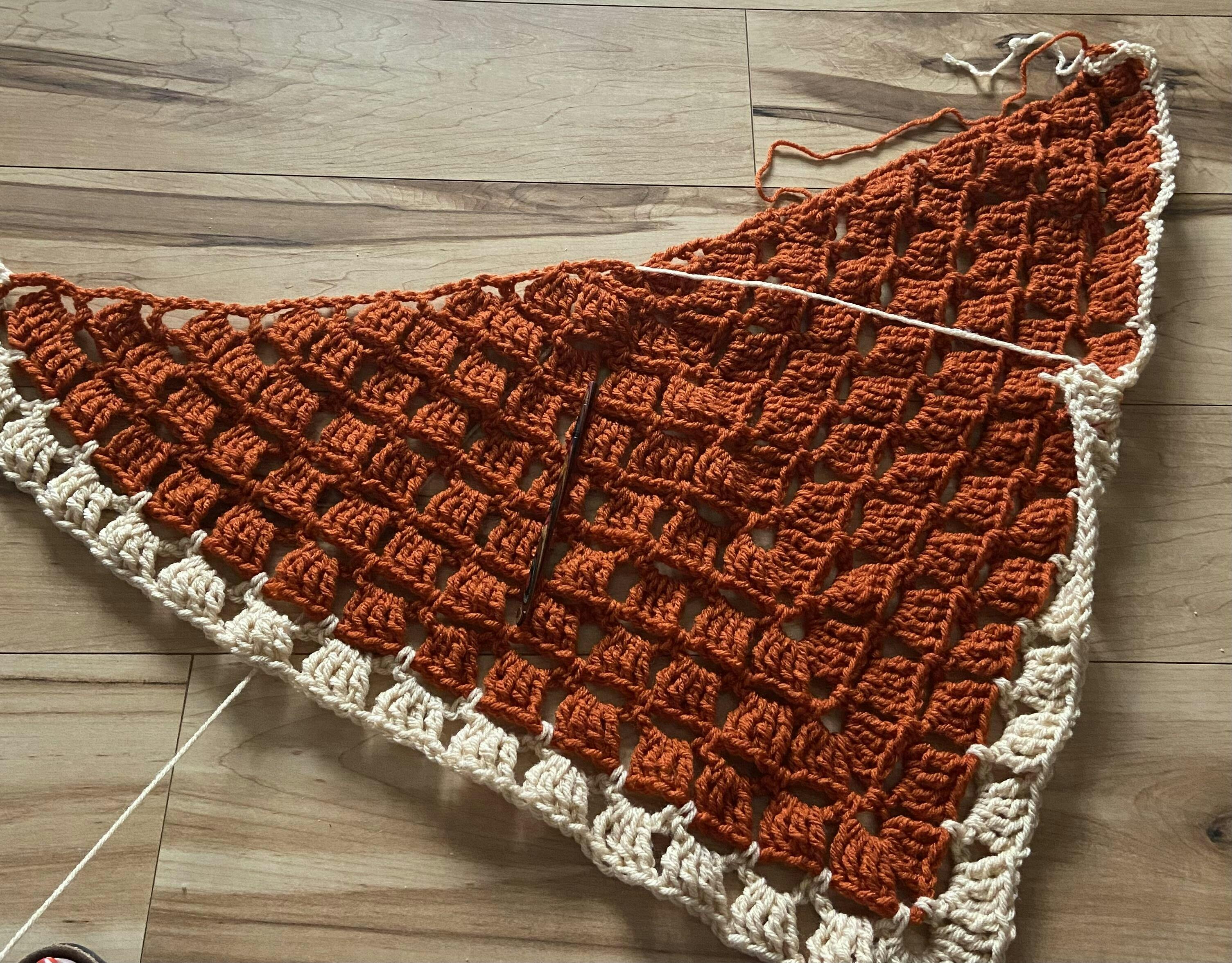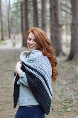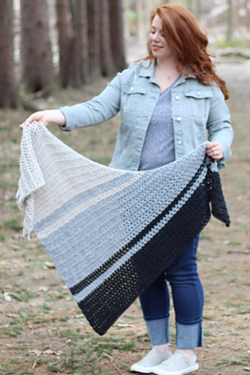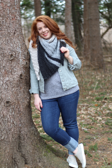 The North Woods Shawl uses a modified version of a very popular stitch to create a subtle and modern texture. This color blocked triangle scarf is a great accessory for transitioning through the seasons as it uses a worsted weight yarn, and is a perfect project for all skill levels.