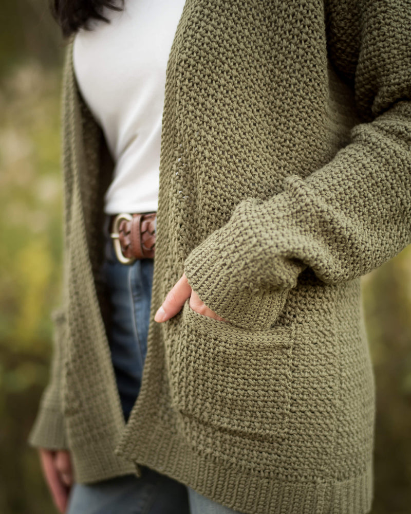 The Olivewood Cardigan is a gorgeous relaxed cardigan with amazing texture! Crocheted using a cotton/bamboo yarn, this garment drapes beautifully and feels lovely against the skin. The sophisticated ribbing, cozy pockets and beautiful stitches will have you reaching for this cardigan again and again!