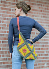 18.5” wide by 9.5” deep at shallowest point with a 28” shoulder strap.