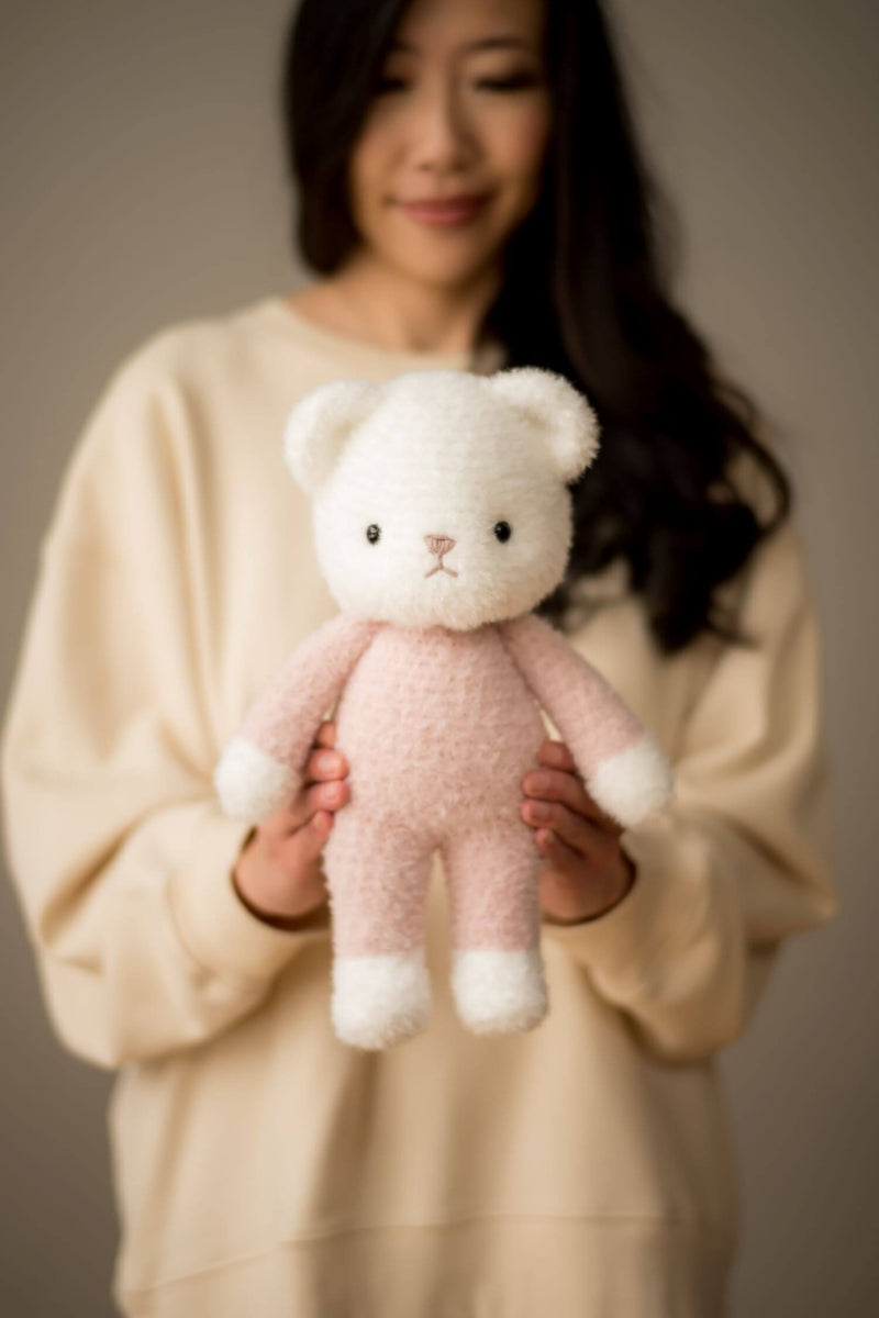Crochet these adorably cozy teddy bears wearing pajamas! They are perfect for cuddling using a delightfully soft yarn.