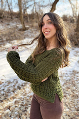 The Pine Grove Pullover is a cozy and stylish crochet sweater featuring gorgeous texture and effortless wearability. Side slits add comfort and movement, making it perfect for layering. While shown in a beautiful green, the yarn offers plenty of color options to suit your style. A step-by- step video tutorial is included to guide you through every stitch!