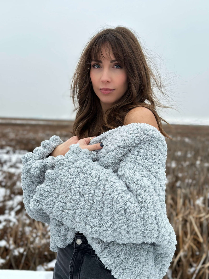 Cozy up in this oversized Polar Puff Coat on those long and chilly days. The Polar Puff Coat is worked from side to side with minimal seaming. It requires minimal shaping and basic stitches so you can easily feel your stitches as you go. It has a wide rectangular fit and cute puff details along the edges.