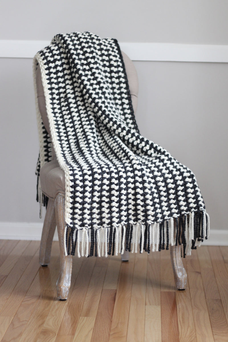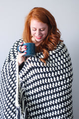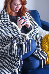 The Prim Stripe Throw is a perfect blend of modern and classic with this striped design. This pattern uses beginner level techniques, alongside super bulky yarn and a large hook, making this blanket work up very quickly! The wool blend yarn is great for the colder seasons, and is offered in many beautiful color combos to compliment any home.