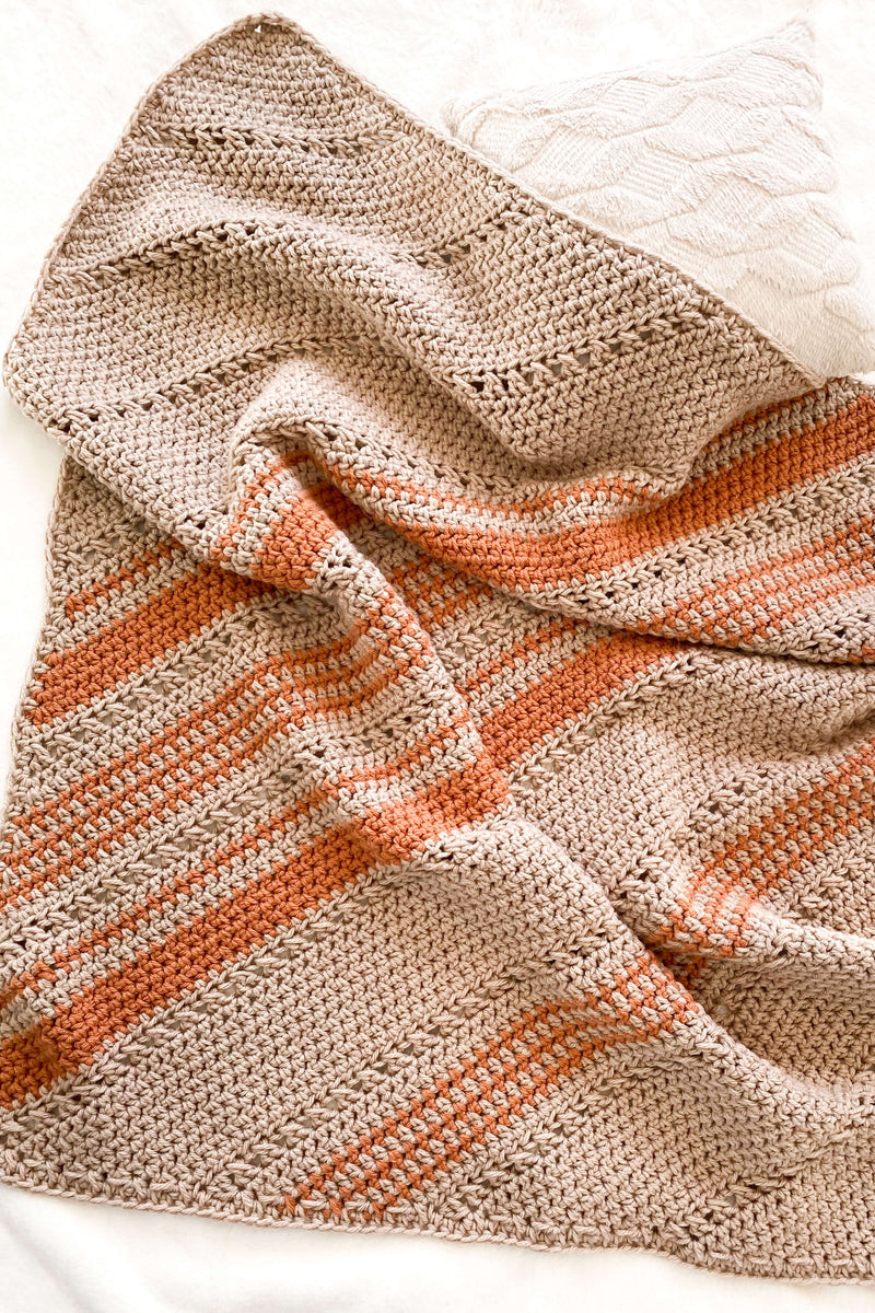 My favorite latte in a blanket! These colors reminded me of my favorite PSL coffee and helped add an extra dose of cozy to it! The relaxing repeat worked on the bias is full of texture whilst having a fun blend of random stripes!