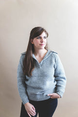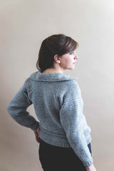 The Rainier Sweater is a V necked pullover with delicate ribbing along all the edges and simple single crochet stitches throughout. It’s a thick, warm pullover with excellent drape and excellent texture for a day around the house or a hike in the woods!