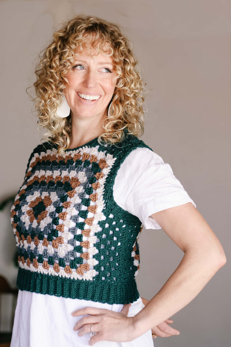 Two granny squares come together with zero shaping to create a topper that perfect to throw on over a t-shirt or dress. Skills you’ll practice include working in the round, double crochet and basic seaming. Get your granny game on point with this easy vest pattern!