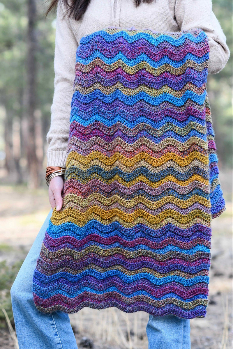 Tweed colors and gorgeous textured waves come together to create this, rustic, eye catching throw! The yarn includes two colors in each strand, adding to the depth and interest of this super soft blanket. And because the yarn’s color changing, the stripes appear on their own so there’s no weaving in a bunch of ends. Whether you’re in the mountains or the city, this throw will add a welcome comfort to any space. Light weight for any time of year, and you can choose your own colors!