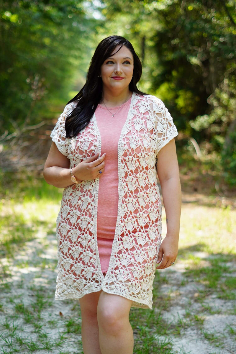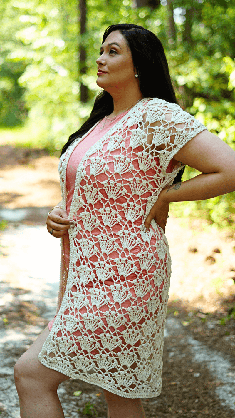 This chic staple piece is called the Royal Ruana. You can style this design for any occasion. Date night out on the town, a beach cover up, or even as an extra layer for a more casual look. The NO SEW pattern offers a wide range of sizes to suite every body type. The lace design features a fun yet elegant shell Puff stitch pattern that really brings the design together.