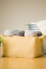 Crochet this gorgeous basket using Re-Tweed yarn that has a rustic look to it with its tweed flecks and muted colours. The shape of this basket is unique with its rectangular base and rounded corners. The sturdy straps allow you to carry the basket around and store all your items inside. This basket is a great way to add a touch of sophisticated elegance to your homes! Optional wiring in the edging and an optional cardboard base help to further emphasize the shape and sturdiness.