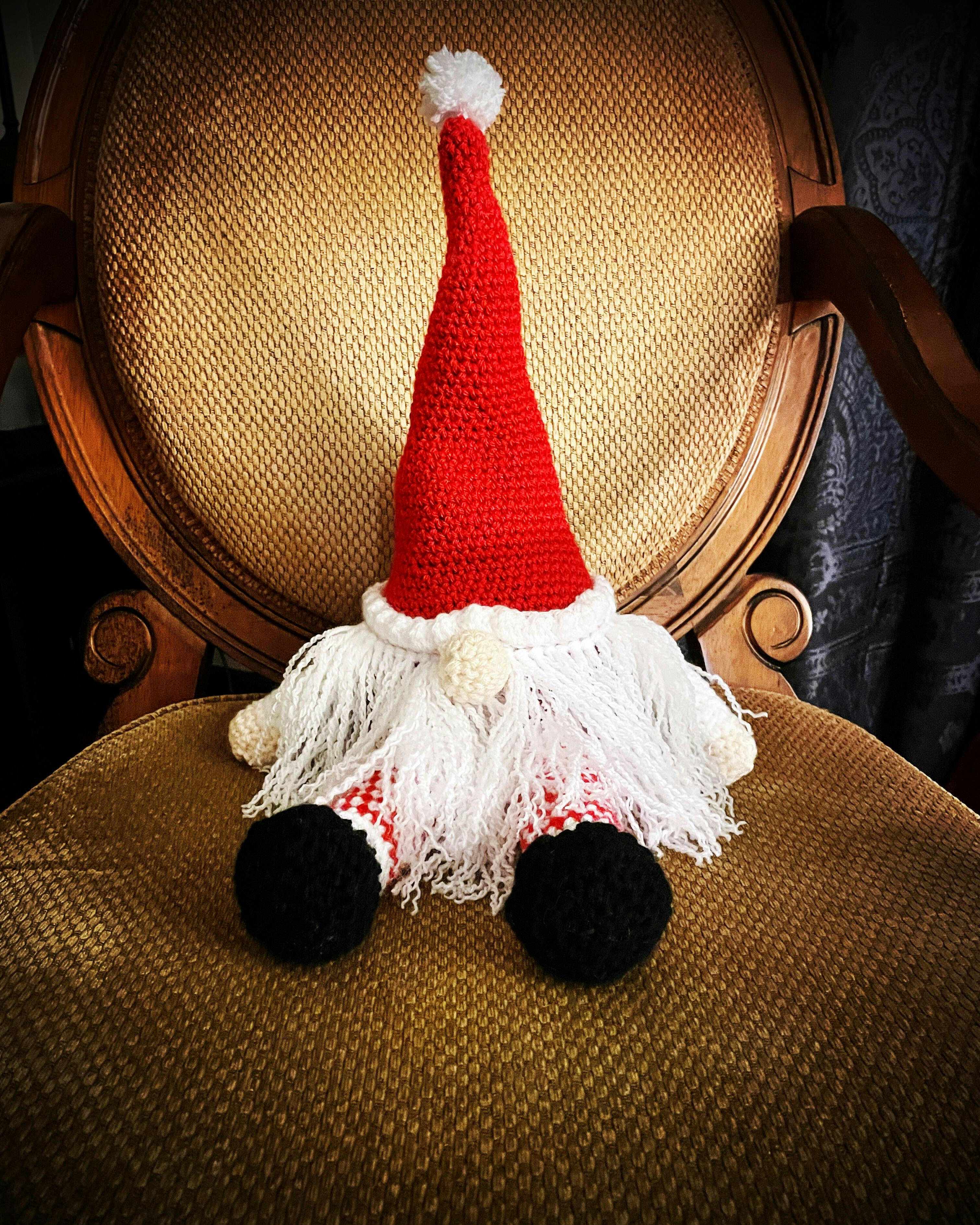 I am making this for a gift…..still working on all the parts. I ran out of the red yarn, so the stripes on my arms will be a different color. The directions are very good and result in cleverly shaped body parts. I talked with somebody I know who does a lot of this type of crochet, and it was suggested to crochet a triangle and attach the beard yarn through that (comb it out for the fuzz look). I think I will do that. This is not a quick project, and I find making all these little parts tiring. The yarn is prone to split too. Although my gnome is looking very spiffy, I would not do this project again.