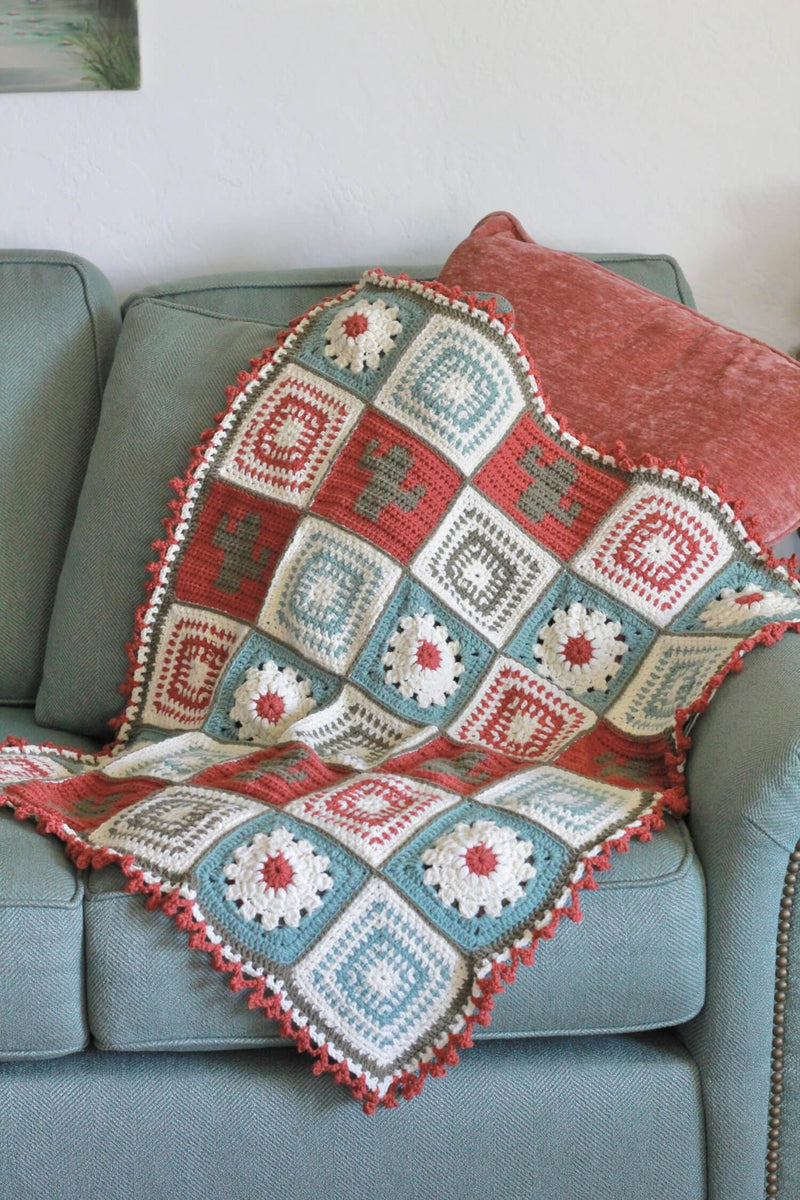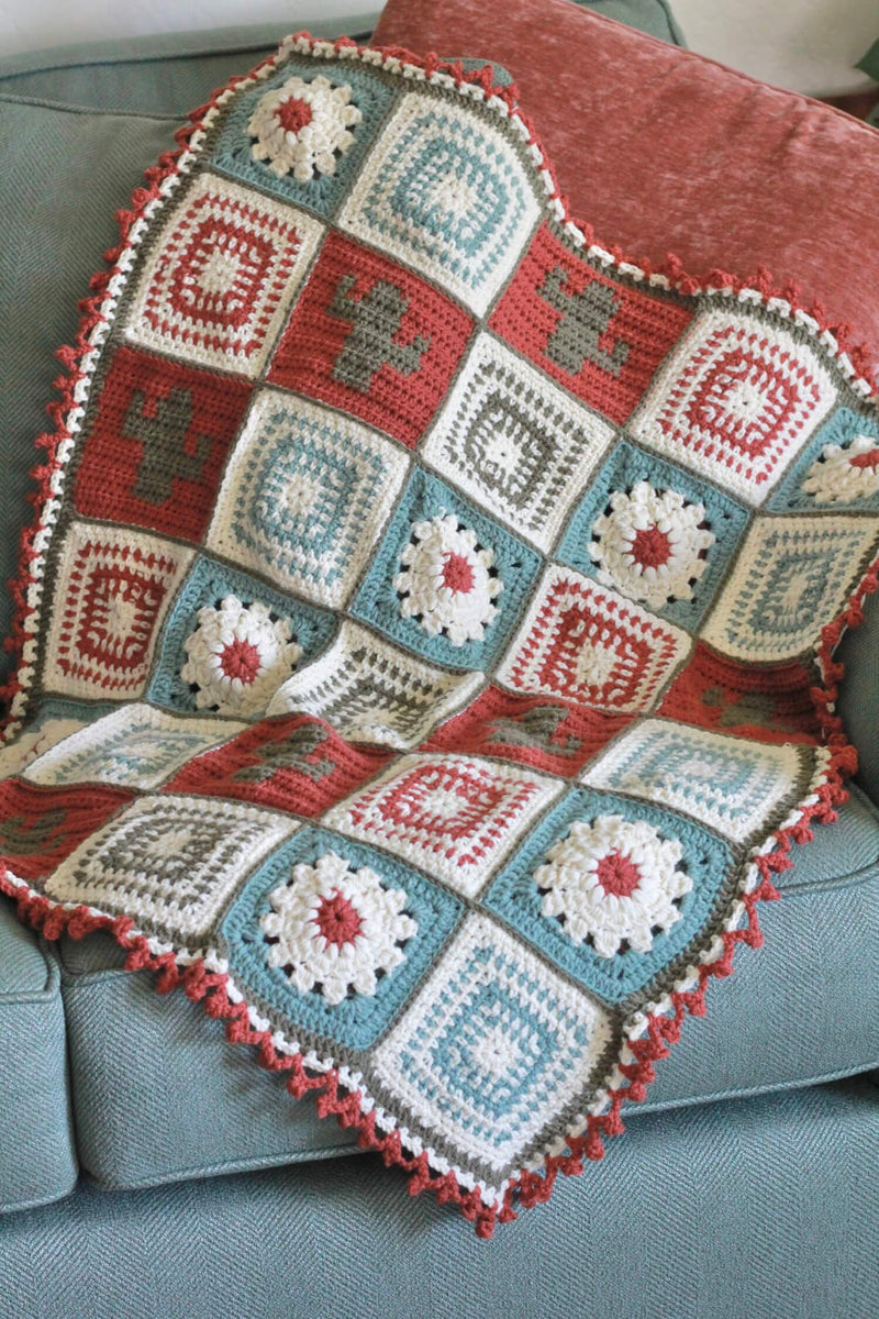 Transport yourself right to the desert with the Sedona Blooms Blanket! Inspired by the rich earthy colors and uniqueness of cacti, this blanket is sure to wow. It is made up of three different squares using a variety of techniques that form a beautiful blanket. If you love boho style, then this is the blanket for you!