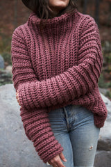 Oversized and chunky, this ribbed turtleneck is the ultimate statement sweater for fall. The fabric is both drapey and voluminous due to a stitch that mimics a knit brioche worked up on an extra large hook. The result is squishy, cozy heaven that molds to and hugs the body.