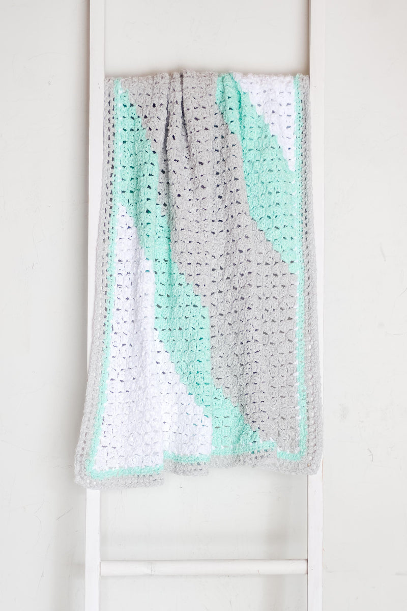 Work up an easy diagonal striped baby blanket using meditative corner to corner crochet. You’ll love the supple, soft stitches and so will the lucky baby who is snuggled in them. This c2c crochet pattern is ideal for those new to the technique because it requires no mid-row color changes.