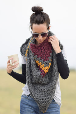 Wrap measures approximately 57 inches across and 27 inches from middle top to bottom point of triangle, however you can easily make it larger or smaller.