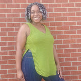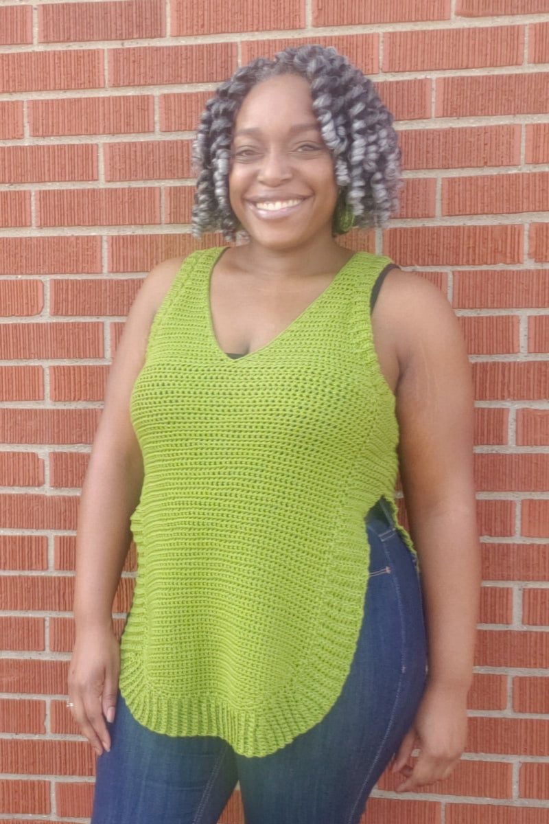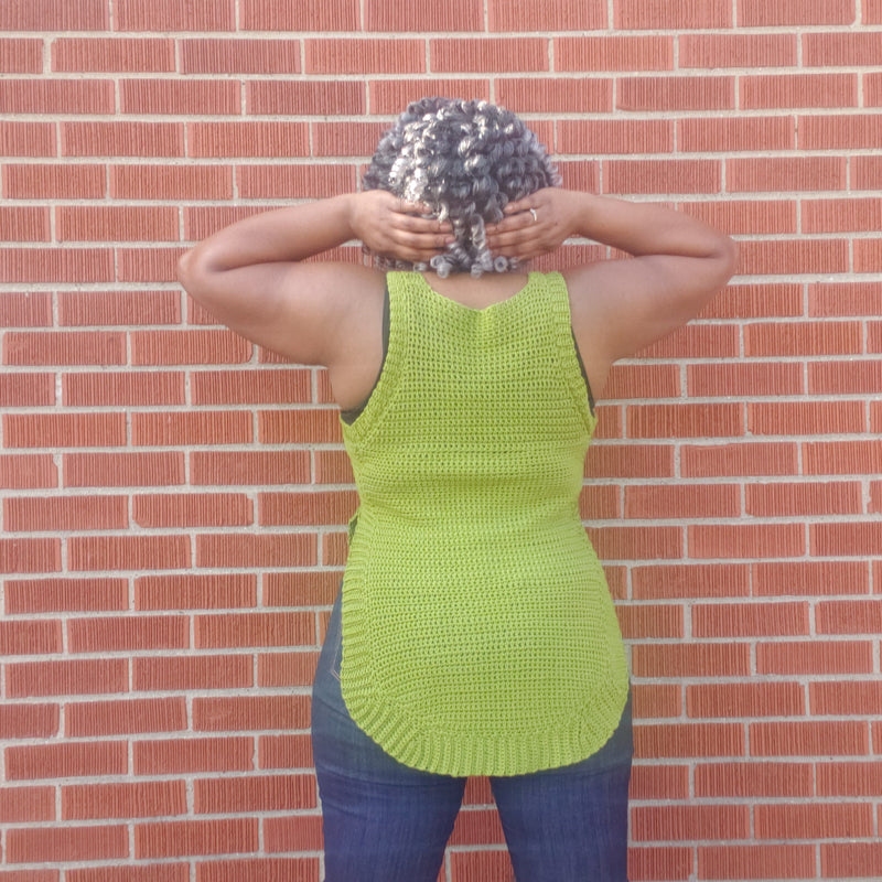 The Split Tank is working in sectioned panels and seamed at the shoulders and under the arms. The front and back yokes are bottom up after the front and back curved panels, which are made top down. It is a fitted tank that falls away from the body naturally with the split sides. The Split Tank is perfect as a swim cover-up or wear it on its own. The styling options are endless.