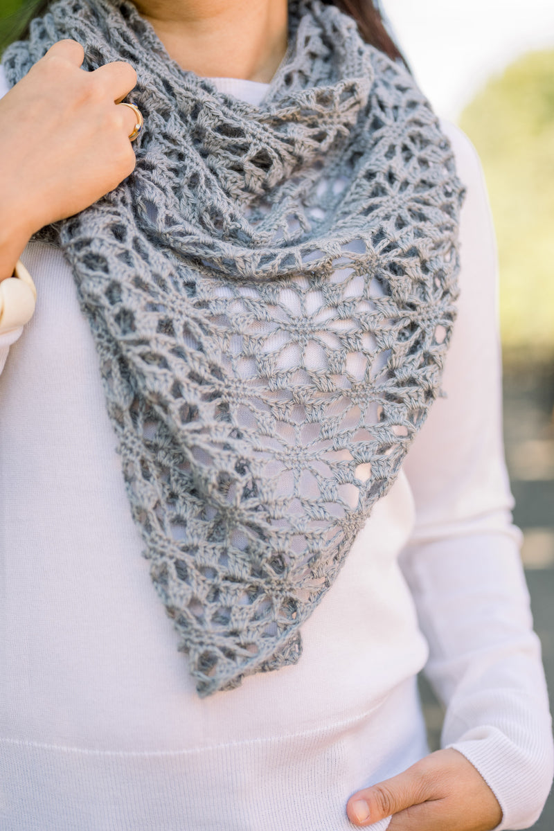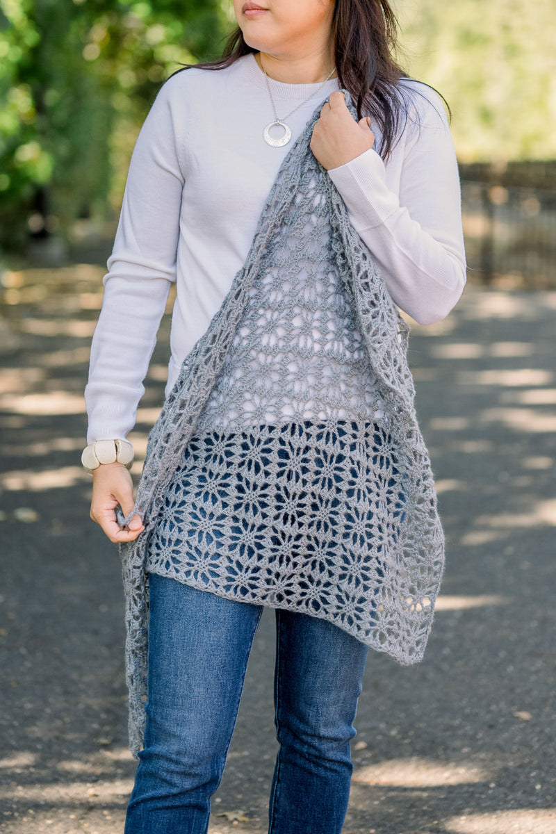 Gauge is approximate because of the lace motif. Unblocked gauge may be slightly tighter, as the lace can be aggressively blocked to bring out the star/flower motif.Dimensions Detail