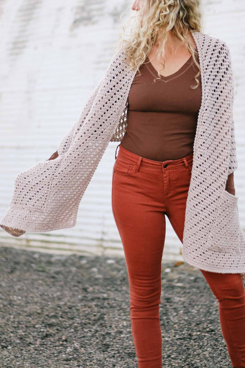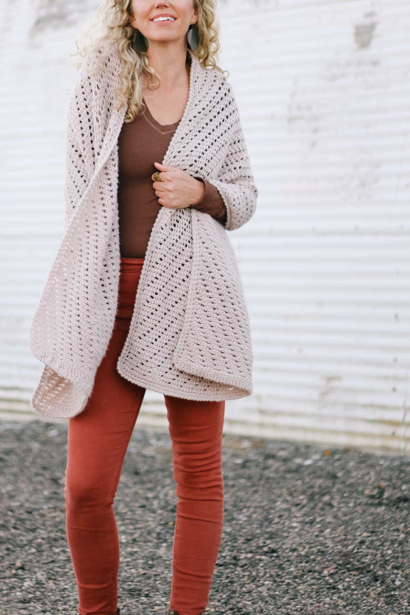 Wrap up in a cozy crocheted hug, complete with perfectly roomy pockets. This pocket shawl is a meditative, simple Tunisian crochet project that’s comforting to both make and wear. The eyelet stitch pattern is easy to memorize and creates a beautifully flowy fabric.Add optional wooden buttons in the front to create a poncho-esque look!