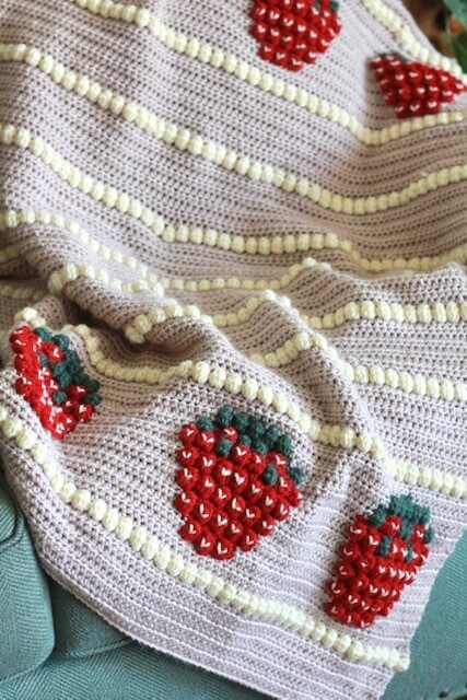 Calling all strawberry and crochet lovers! The Strawberries and Cream Blanket is for you! This cute crochet blanket features strawberries made from bobble stitches, and rows of bobbles to give it a sweet look. It uses easy crochet colorwork techniques so that even if you are new to colorwork, you’ll be able to make it! The blanket comes in two sizes, Baby and Lapghan, making it great for a nursery or your living room.