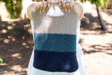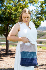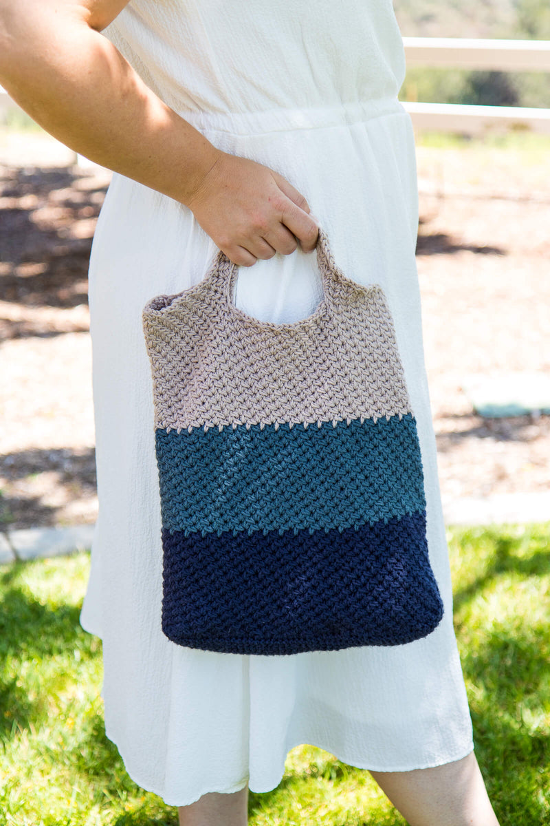 The elegant striped tote bag is sturdy and great as your next project bag to store your WIPs. This sturdy bag doesn't need any lining due to the thermal stitch on the bottom of the bag and the diagonal chevron stitch on the body of the bag. Pick your favorite 3 colors of the Color Theory yarn and crochet this cute tote bag in just a few hours.