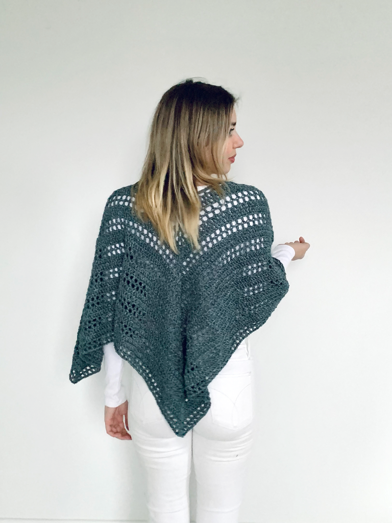 This poncho is a simple 4-row pattern repeat and all you need to know is how to make chains, slip stitches and double crochet stitches. No seaming required and available in size S/M, L/XL, 2XL/3XL, 4XL/5XL.