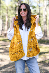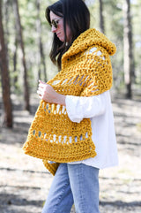 Big stitching, happy vibes, and eye catching fabric make the Sun Kissed Hooded Wrap a beautiful option for cool morning walks, festivals, or coffee with friends. It’s a super quick and easy project since it’s made with big yarn and simple stitches. It’s SO comfy too! (Two sizes available)