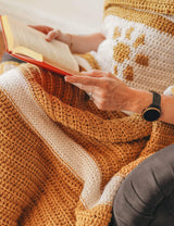 Add some sunshine in your life with the Sunray Throw! Included is a printable and digital chart of the sun intarsia colorwork sections, so you can easily track your individual progress. Slip stitches are used for the contrasting stripes to create a knit-like fabric and the center stripe has an exposed edge for added texture.