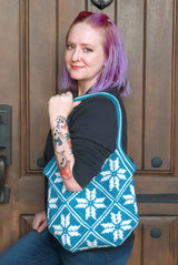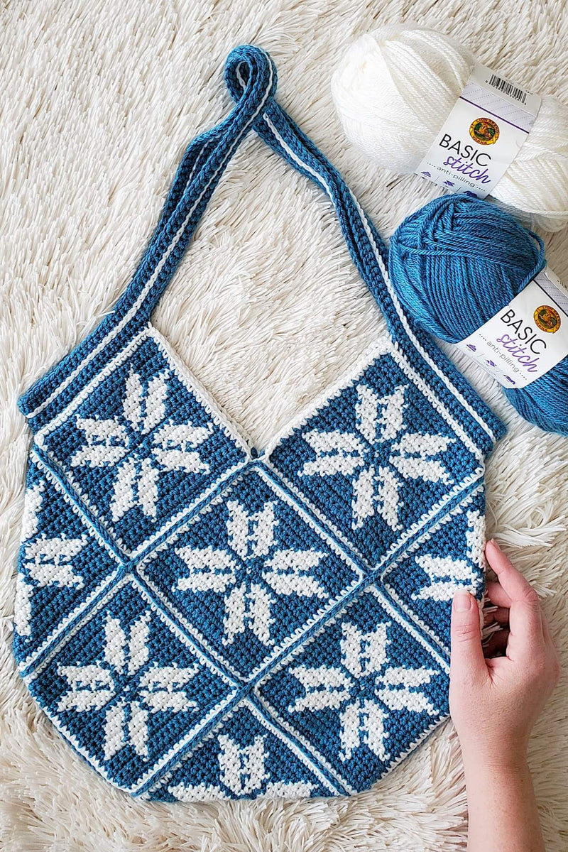 The winter season doesn’t need to be only scarves and sweaters with the Susie Snowflake Bag. This eye-catching and fashionable design starts with 13 individual squares, worked from the bottom up in single crochet stitches. This bag is fun, sturdy, and makes a great project bag for the whole winter season. And don’t let the color work worry you, if you can do a single crochet you can make this design – just check your gauge and keep your tension even.