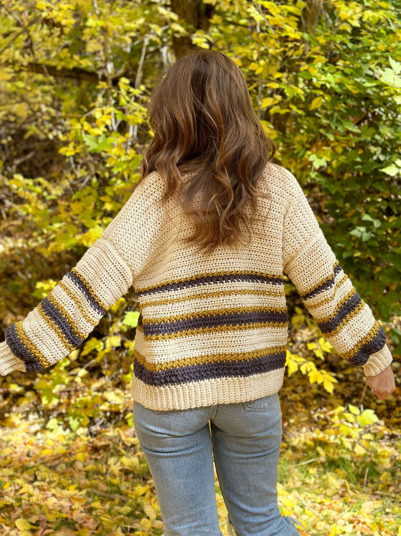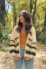 Toss on The Tea Time Cardigan for all the cozy vibes. This cardigan features fun stripes using a unique blend of stitches, giving it a collegiate look. It has a slightly oversized fit with balloon style sleeves. There are so many color options to fit your style!