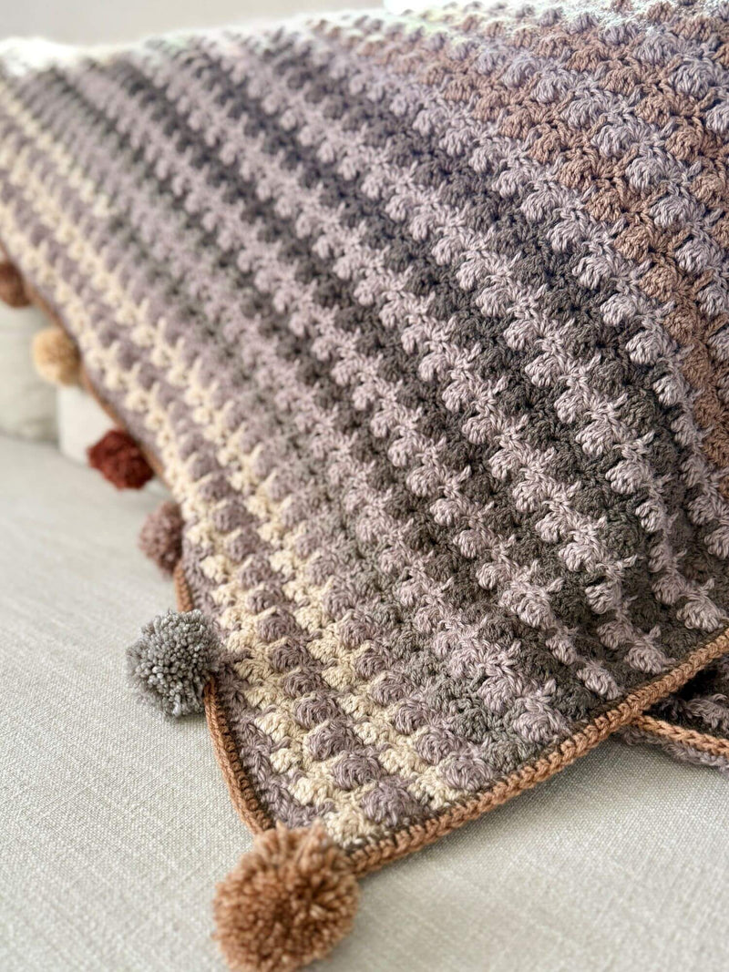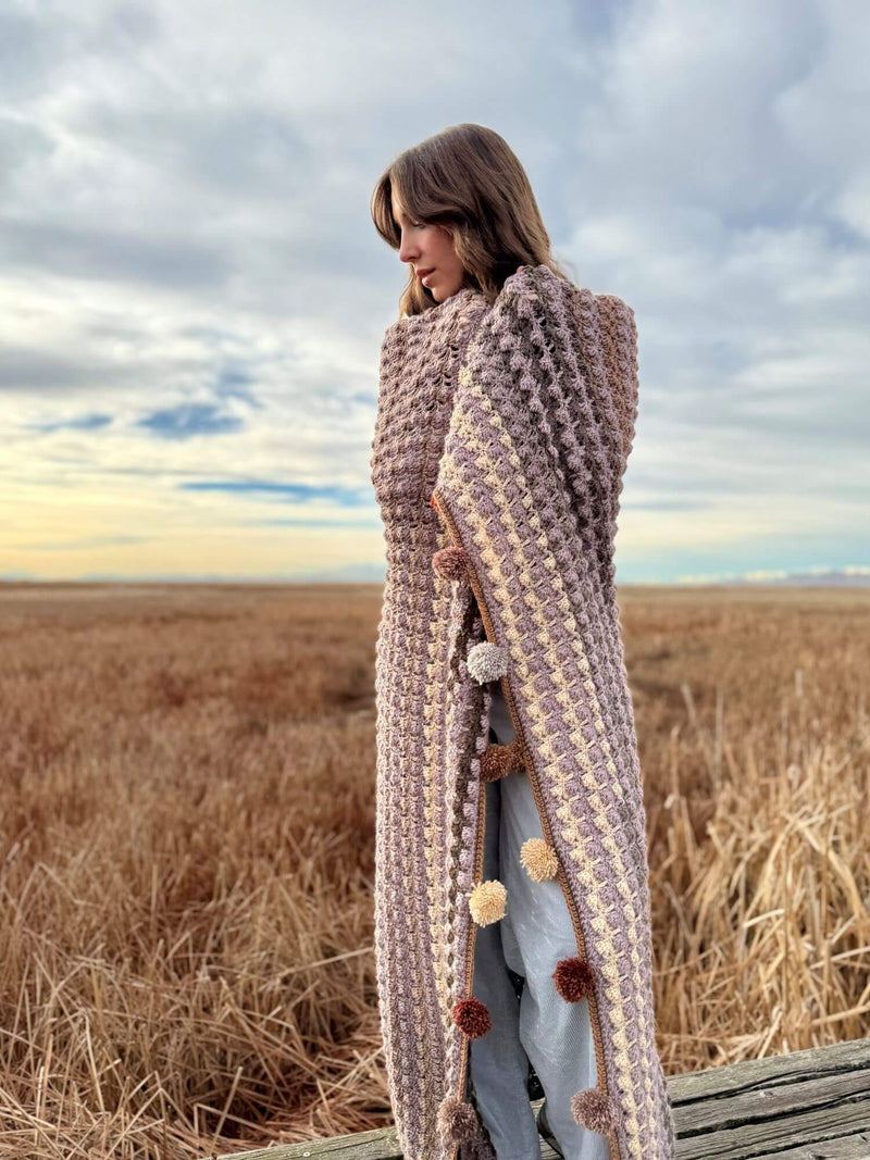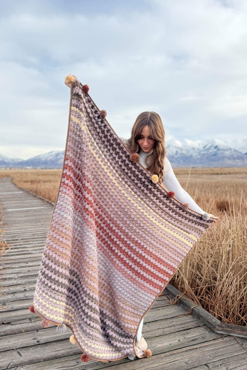 Unwind with the Adagio Throw, a relaxing crochet pattern featuring a fun and rhythmic stitch repeat. This design combines two yarns, including Mandala yarn with color changes that make every project uniquely yours. Finished with playful pompoms along the top and bottom, this blanket adds a touch of charm to any space. Easy to follow, the pattern comes with a detailed video tutorial to guide you every step of the way.