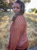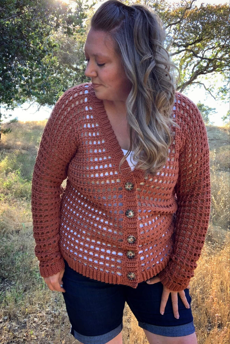 Introducing the Flynn Cardigan crochet pattern, a stylish and quick project using Lion Brand Pima Cotton yarn. This classic design features a button-up V-neckline and an airy open mesh stitch for breathability. Perfect for layering year-round, it adds sophistication to any outfit with minimal effort.