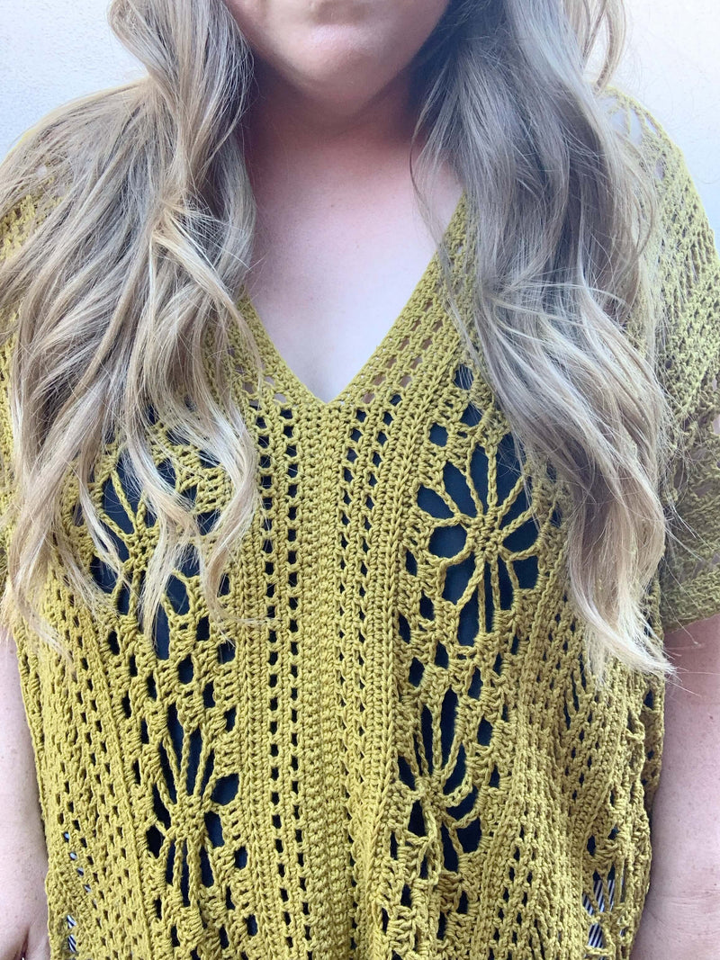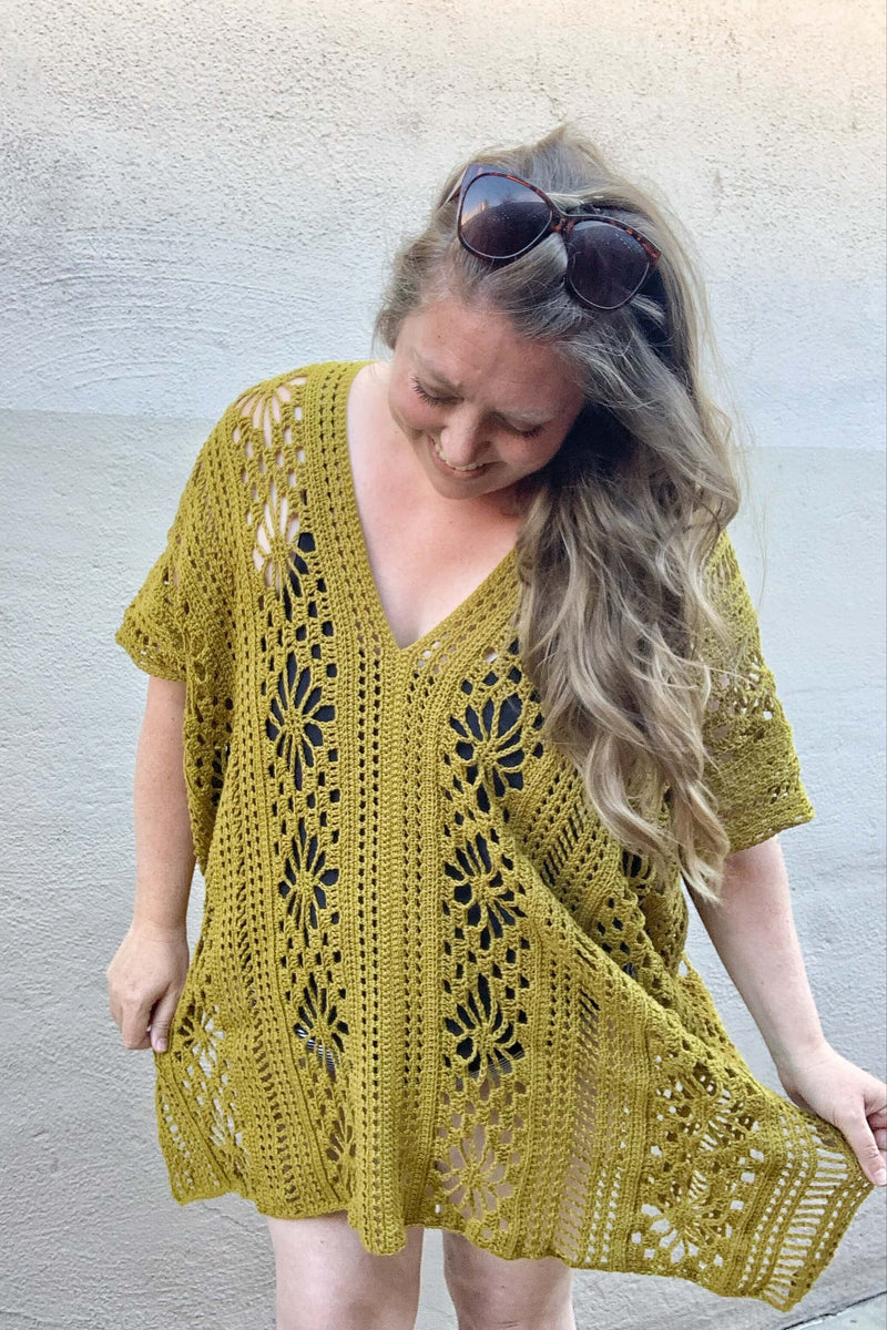 Make a splash this Summer with The Kait Cover Up crochet pattern. This stunning cover up is made of two lacey panels featuring a beautiful floral design, which are then seamed together to create an oversized flowy cover up perfect for all shapes and sizes.