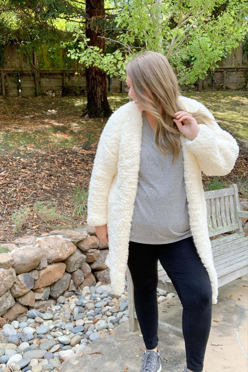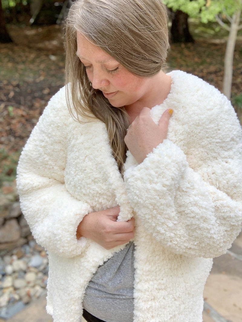 Get the Lottie cardigan pattern and make yourself a comfy and super stylish cardigan. This is a pattern for knitters of all skill levels, even beginners. You can knit a warm, cozy cardigan that will be a welcome addition to any fall wardrobe with the Go For Fleece Sherpa yarn.
