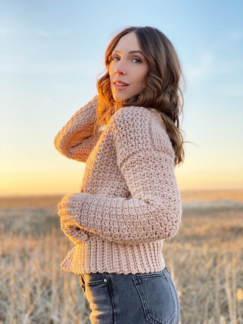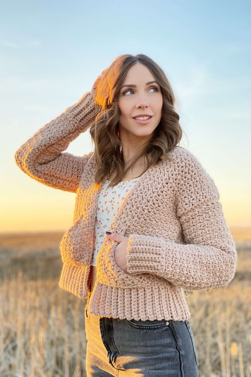 Cozy up in the Sunset Bomber all winter long! It features a wide ribbing and warm pockets! This cute jacket works up quickly with the bulky yarn so you will be adding to your wardrobe in no time!