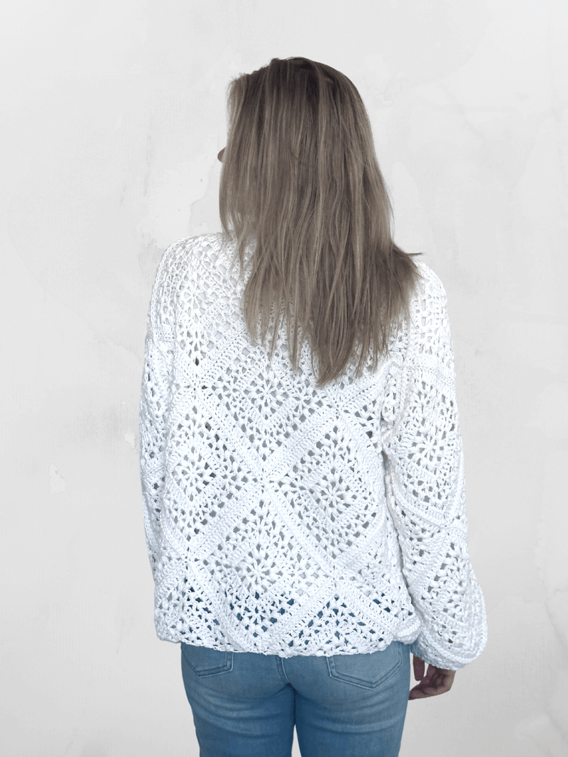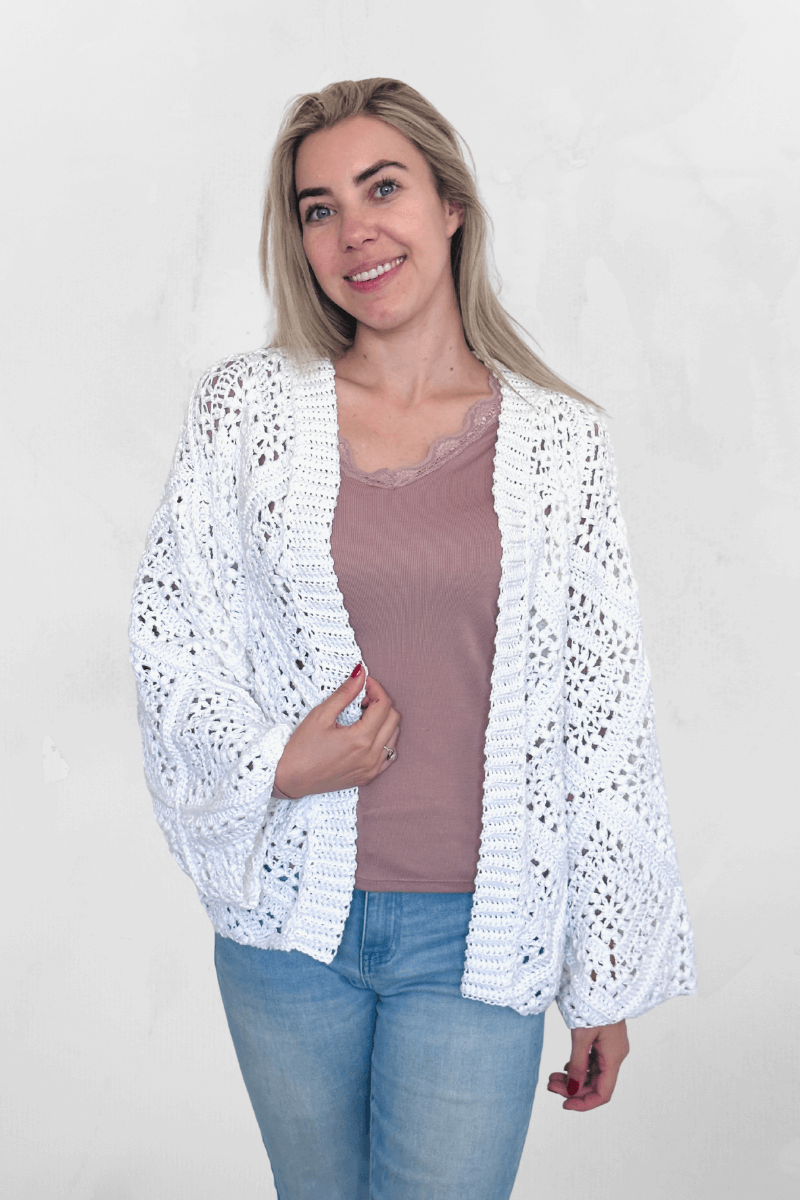 For reference, the model is 1.63m / 5'4" tall with a 34" bust and is wearing the cardigan in size XS/S/M.