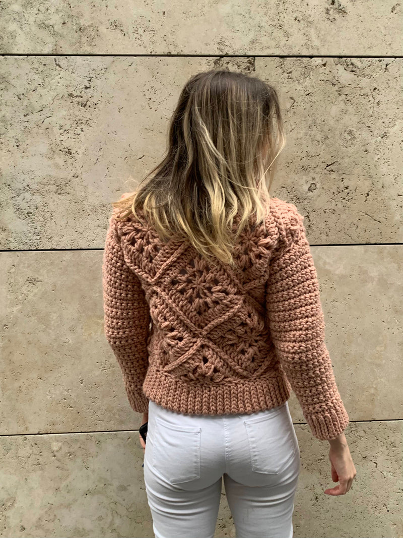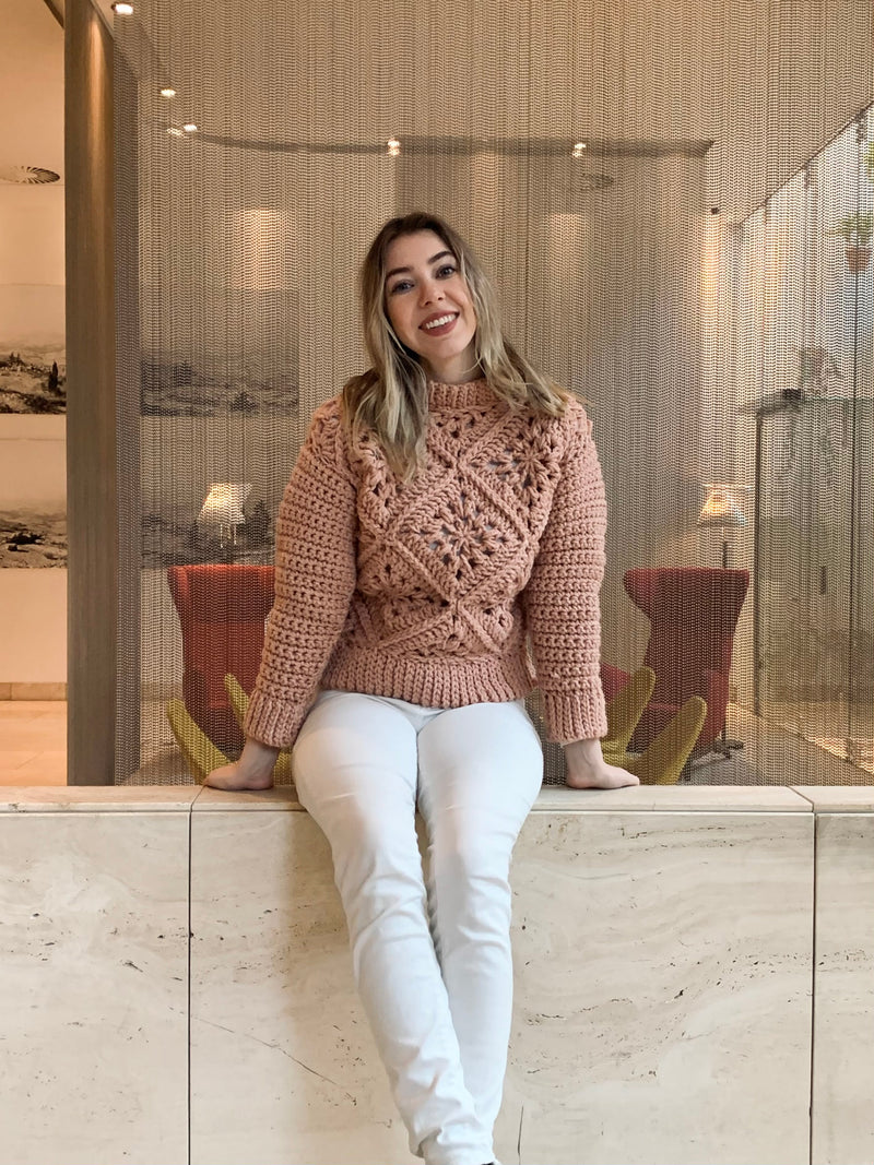 This chunky Tulip Square Sweater is made out of squares and triangles slip stitched together creating two big squares for the front and back panel. Sleeves are worked separately and sewn onto sweater. Lastly ribbing is added for a finishing touch.
