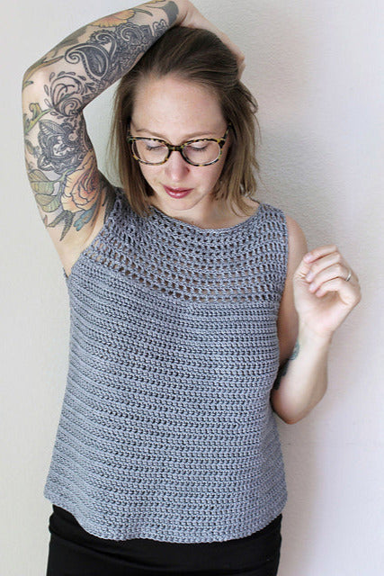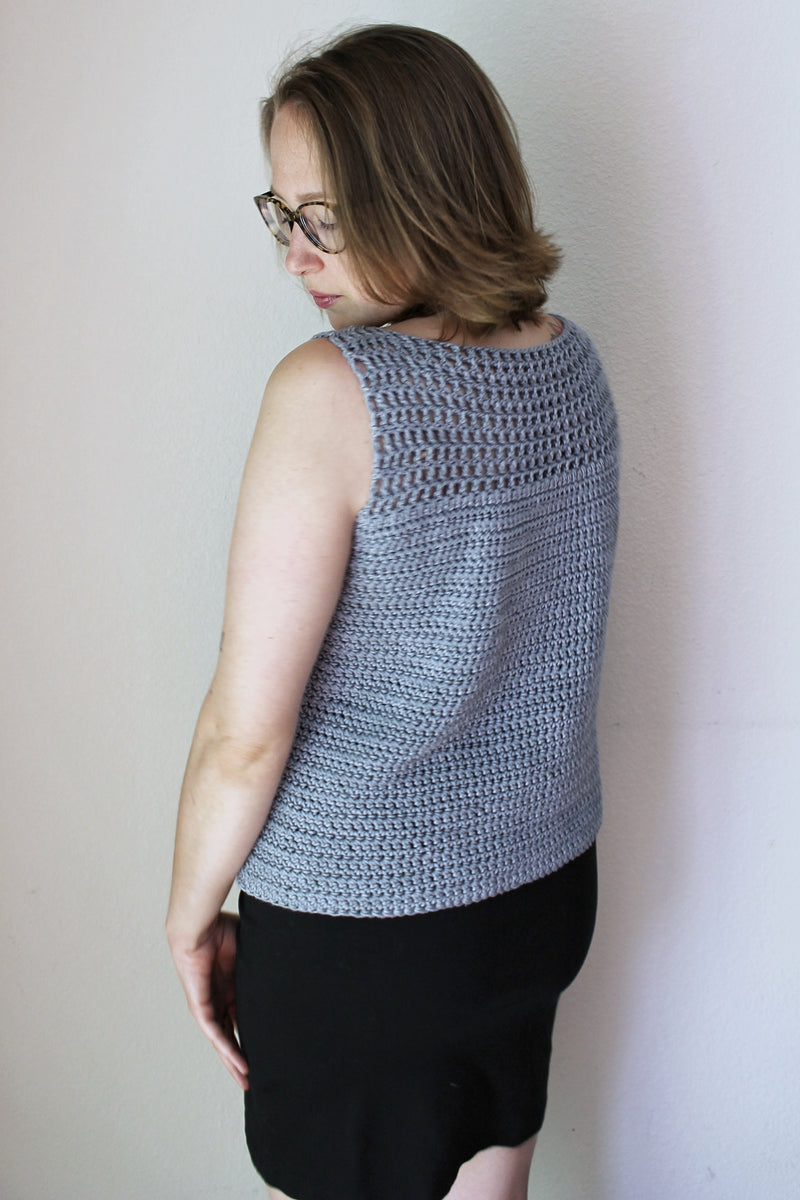 To fit bust sizes: 30” (34”, 38”, 42”, 46”) (50”, 54”, 58”, 62”) with approximately 10” of positive ease in the lower portion of the tank.