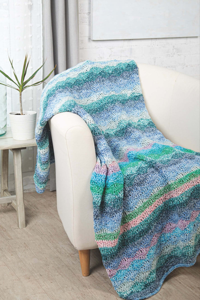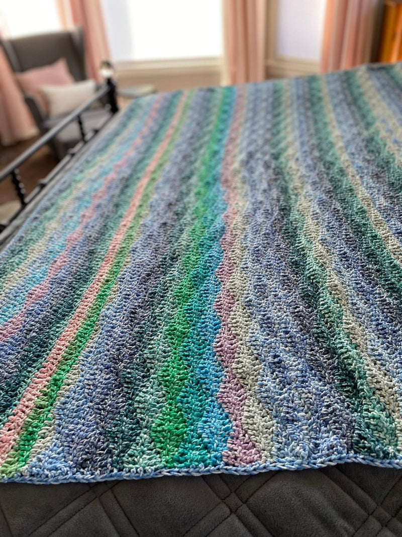 This afghan was inspired by the colors of Monet’s Water Lilies series of paintings. When I decided to do this, I started searching for the right yarn colors and discovered that the Mandala Ombré yarn from Lion Brand was perfect! Along with the wave stitch, you get the feel and look of water with very little effort. Always a win in my book.
