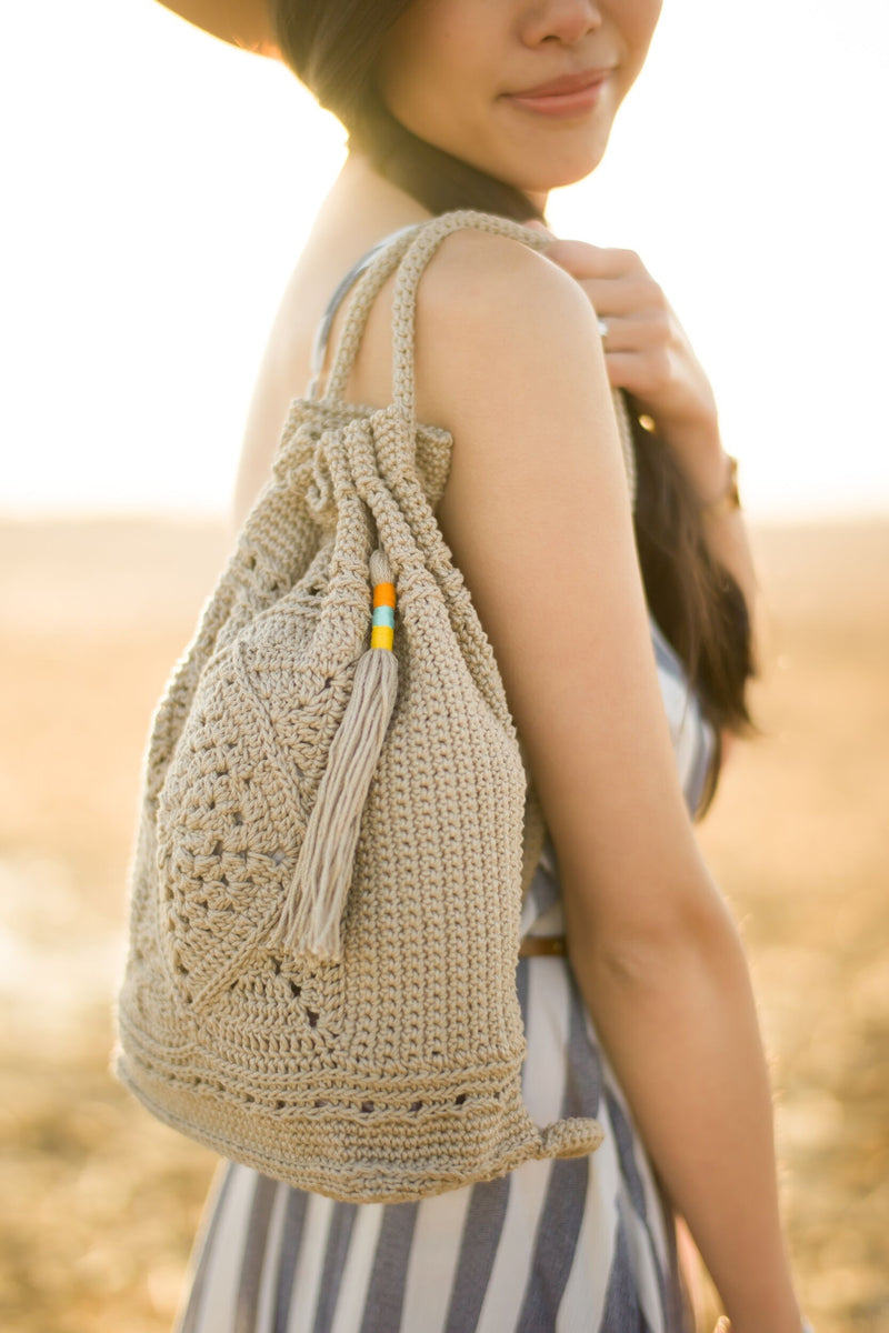 Crochet this stunning Wildrose Backpack to hold your essentials on all your travels and adventures, from music festivals to the beach. The sturdy strap is part of the drawstring closure that allows for easy opening and closing of the backpack. An interior pocket holds your cell phone, and an optional tassel can be added for some pops of color!