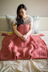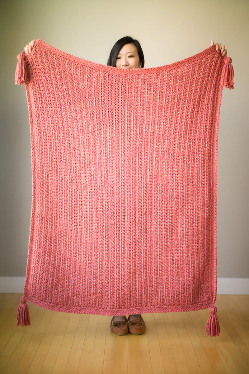 Crochet this beautiful beginner-friendly blanket using basic stitches! The vertical lines and luxurious tassels make this modern blanket a gorgeous touch to any home!